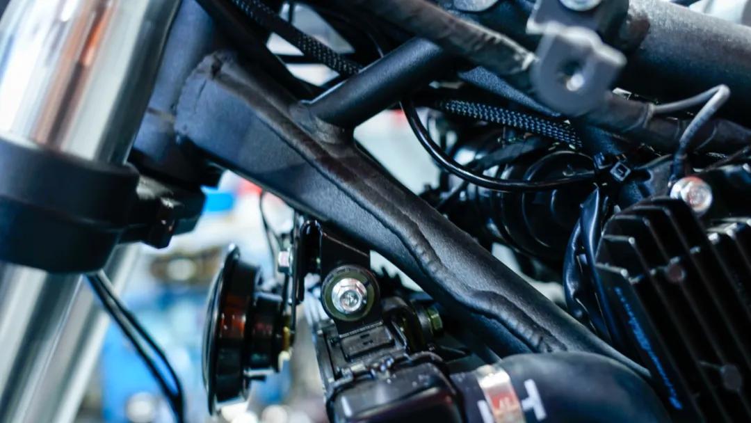 車架采用了主副車架一體式設(shè)計(jì),為鋼管編織車架,整體焊工不錯(cuò),依舊為無極水準(zhǔn)!