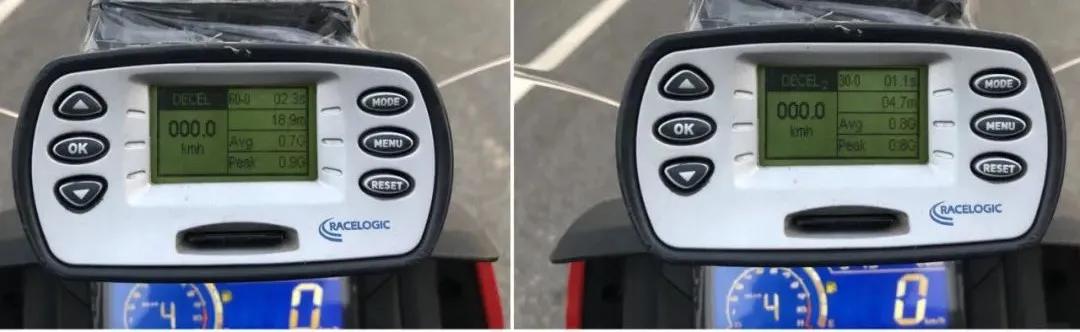制動上CRF190L的配置相比于更為“簡單”,前雙活塞卡鉗配合單通道ABS,后剎車采用鼓式制動器。輪胎的選擇上采用了正新品牌的龜背胎。經(jīng)過多次反復測得,60km/h至0的最好成績?yōu)?8.9m,30km/h至0的最好成績?yōu)?.7m。制動過程中,同時前后大力剎車時,后輪更容易抱死,導致輪胎在地面留下一條黑色的痕跡,能剎出一道煙霧。不過值得稱贊的是,CRF190L在幾次制動中雖然后輪抱死,但一直是以直線剎停,沒有甩尾的表現(xiàn)。