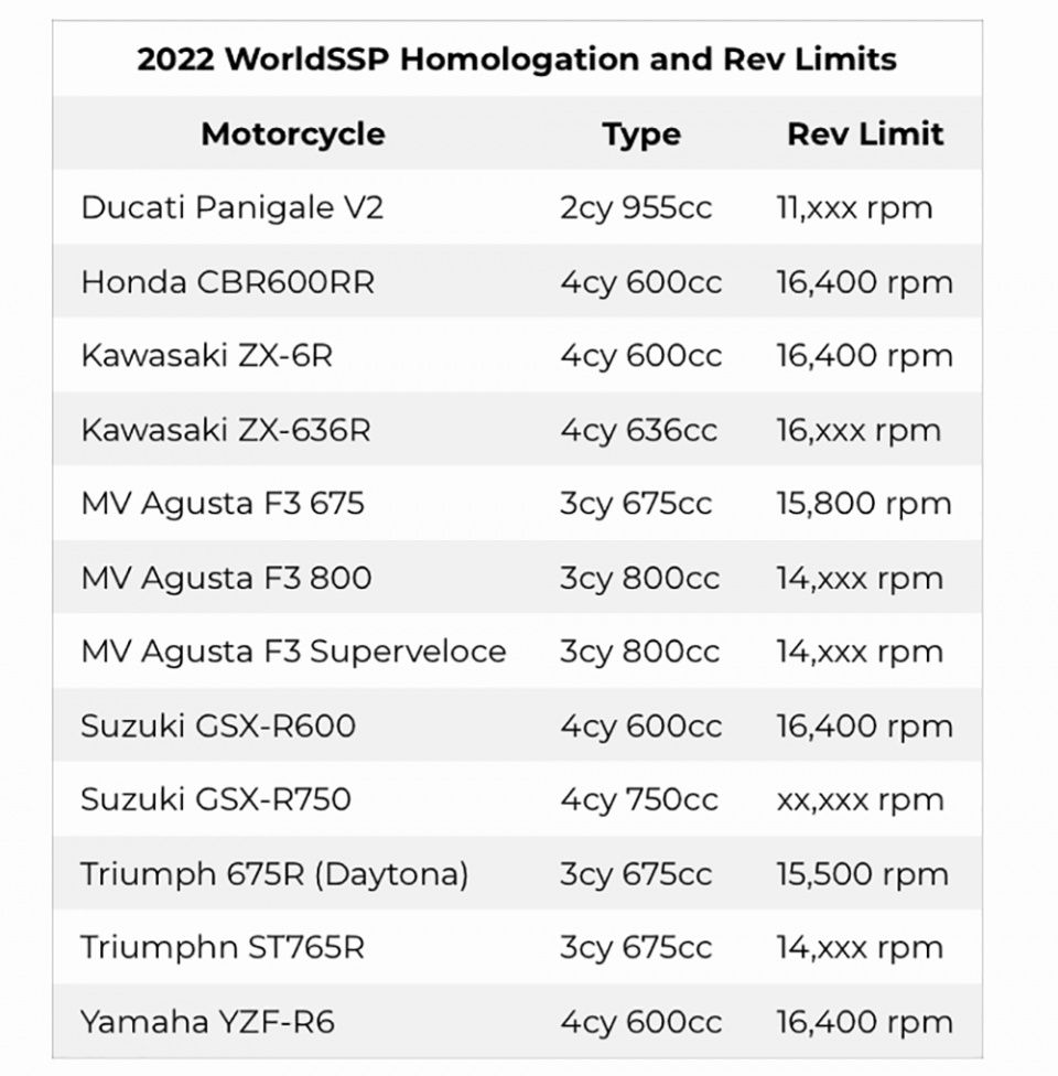 放寬標準之后,包含Ducati Panigale V2、TRIUMPH ST765R、MV Agusta F3 800等眾多新車都獲準參加2022賽季的WorldSSP賽事,其中Ducati可為本次放寬標準的最大受益者,Panigale V2使用的955c.c. V型雙缸引擎,單看排氣量可為遠超其他對手,成為該級距中獨樹一格的存在。