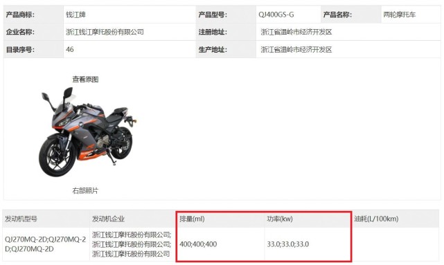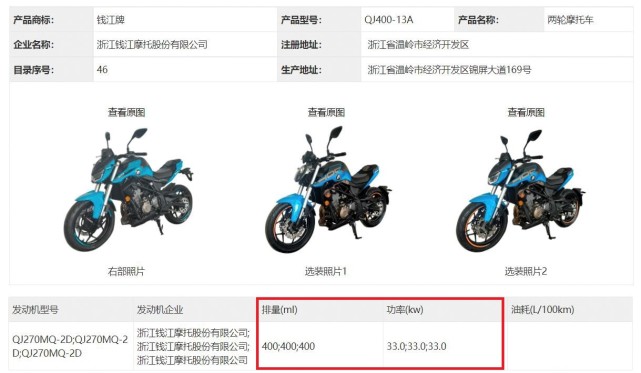 發(fā)動(dòng)機(jī)代號(hào)QJ270MQ-2D,和上次申報(bào)的單搖臂版本一樣,400cc的排量,33kw的峰值功率,幾乎與Ninja400保持一致。其實(shí)這臺(tái)發(fā)動(dòng)機(jī)就是之前引發(fā)熱議的錢江新款發(fā)動(dòng)機(jī),網(wǎng)傳是逆向開發(fā)川崎400的,所以參數(shù)才會(huì)如此接近。