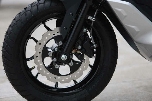 再來看看制動和輪胎的配置:前260mm單盤+雙活塞剎車卡鉗、后220mm單盤+單活塞剎車卡鉗,標配雙通道ABS(SR GT200/SR GT125是CBS),輪胎大小為前14英、后13英寸,配備的是全地形輪胎。