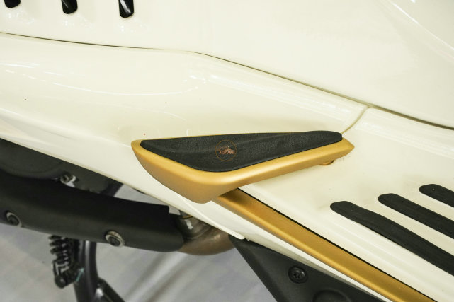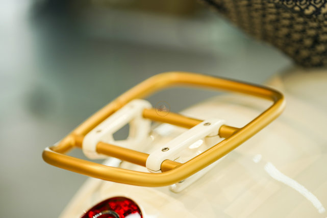 金色緞面部件包括,后行李架、包掛鉤、鋁制后視鏡支架、把手末端、以及鋁合金輪輞的邊緣和輪轂等等。