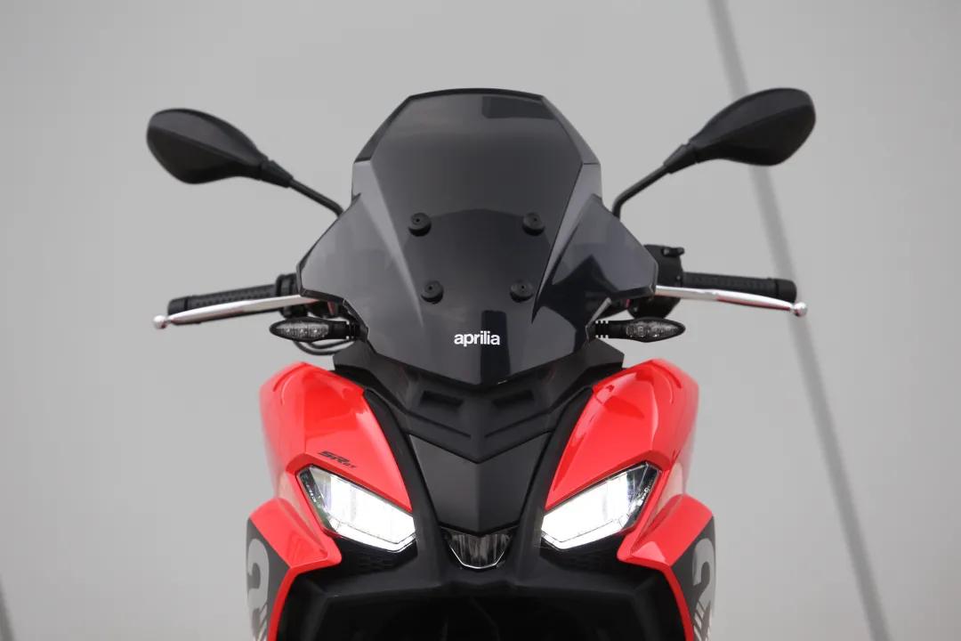 車輛前方裝有全LED三元素?zé)艚M,雙整流罩向車側(cè)延伸,蘊(yùn)含Aprilia摩托車的典型設(shè)計(jì);同時不乏耐力越野摩托車的風(fēng)格,懸掛式擋風(fēng)板和寬大裸露的車把帶來全方位的操控感,尤其有助于在城市低速行駛時控制車輛。精致的壓鑄鋁Aprilia標(biāo)志作為車把固定架,控制裝置操作簡便,符合人體工程學(xué)設(shè)計(jì),也是直接源自摩托車風(fēng)格的靈感啟發(fā)。