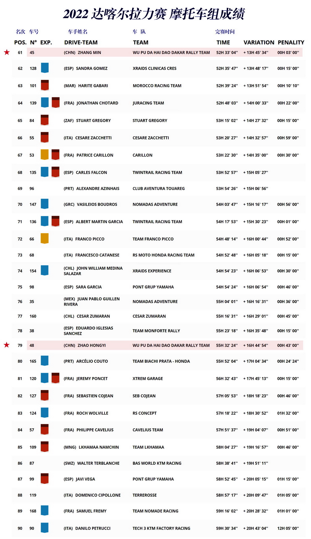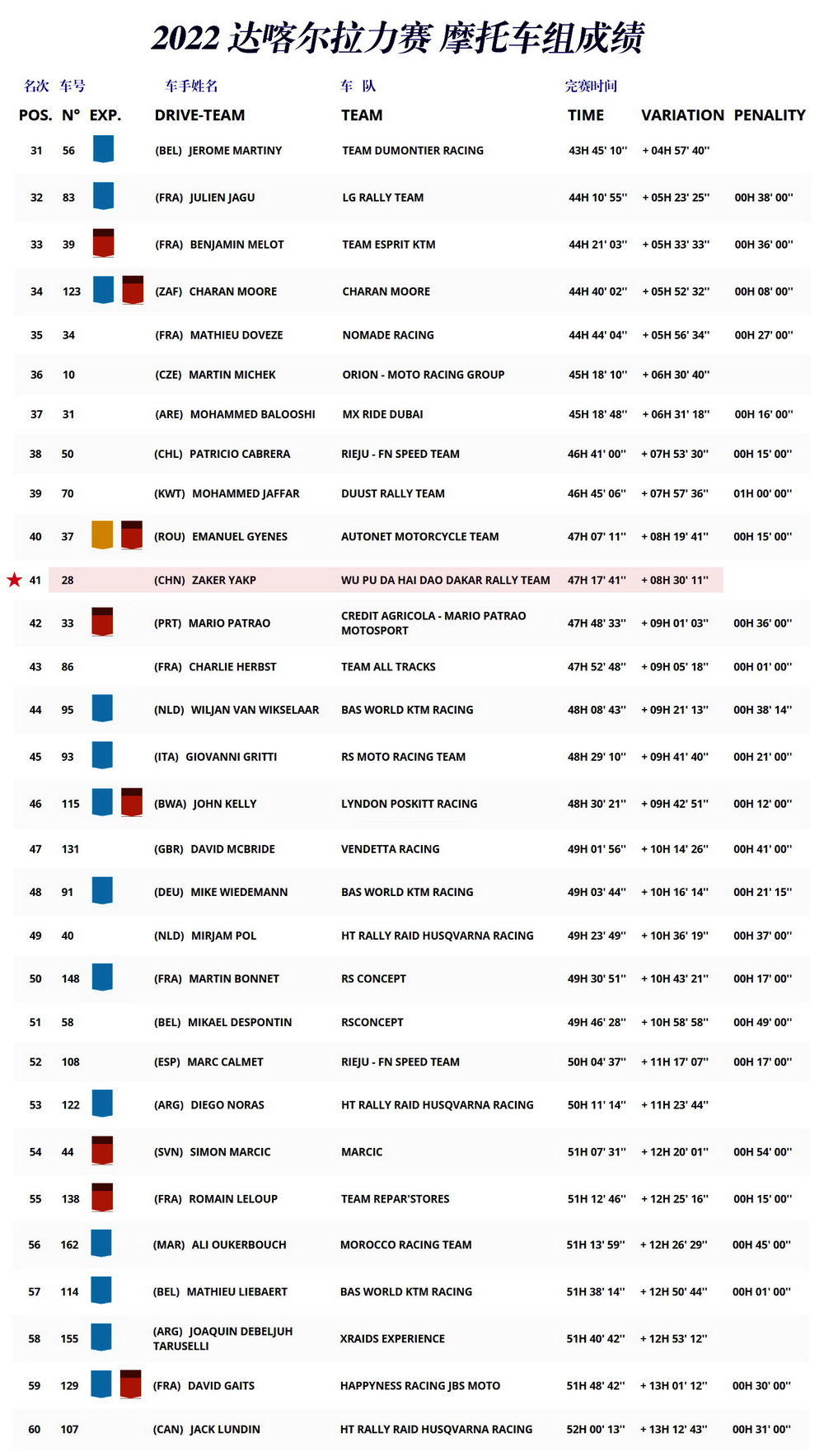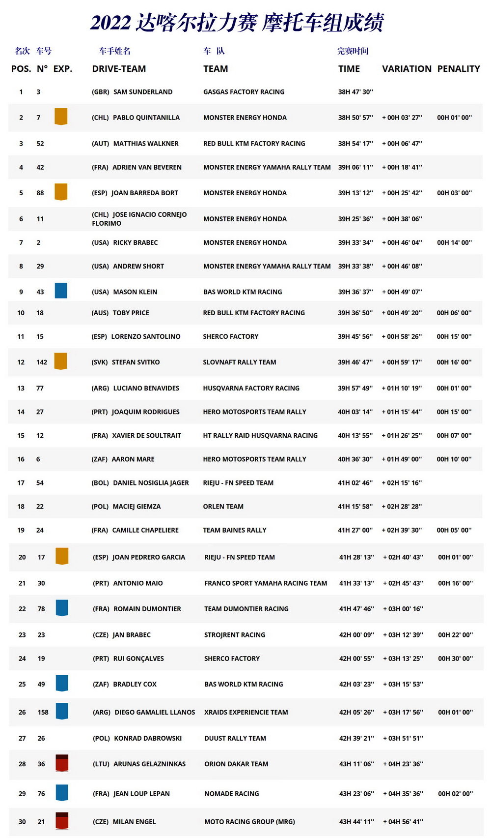 (注:下面成績表中的 EXP. 欄,棕色標簽意為 Legend “ 傳奇車手 ”,參加過十屆以上達喀爾拉力賽的車手,會有此標記;藍色標簽意為 Rookie “ 新秀車手 ”,首次參加達喀爾比賽的車手;雙紅色標簽意為 Original by Motul “ Motul 支援的車手 ”,性質(zhì)上相當于無后援的參賽車手,在特殊情況下可由 Motul 提供一定的現(xiàn)場協(xié)助)。