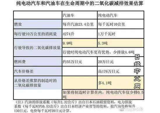 日經(jīng)中文網(wǎng)關(guān)于燃油汽車與電車汽車碳排放的相關(guān)推算(按日本的車輛油耗、發(fā)電碳排放推算)。