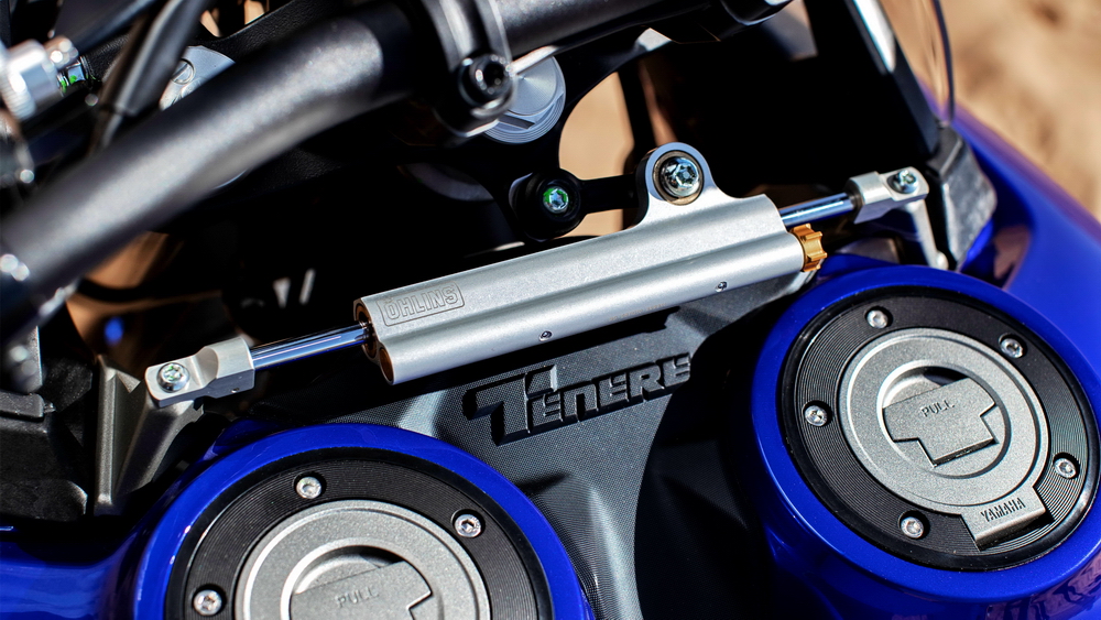 新的 Tenere 700 World Raid 全球突擊版,前懸掛采用了 KYB 配套的、叉芯口徑為 43 mm、行程為 230 mm(另外兩個版本的前叉行程為 210 mm)的倒立式前叉。更長的懸掛行程,意味著在崎嶇地形上的騎行會有更好的適應性。為了提高前叉的耐用性、且減少內部摩擦,該前叉在叉芯有特殊的涂層,內部組件也最大限度地采用了減輕重量的設計。而在另外兩個版本的前叉已具有可調回彈、壓縮阻尼功能的基礎上,新的前叉還配備了可調彈簧預載功能,讓駕駛員能夠針對不同的地形和騎行狀況,更廣泛地對前叉進行設置。