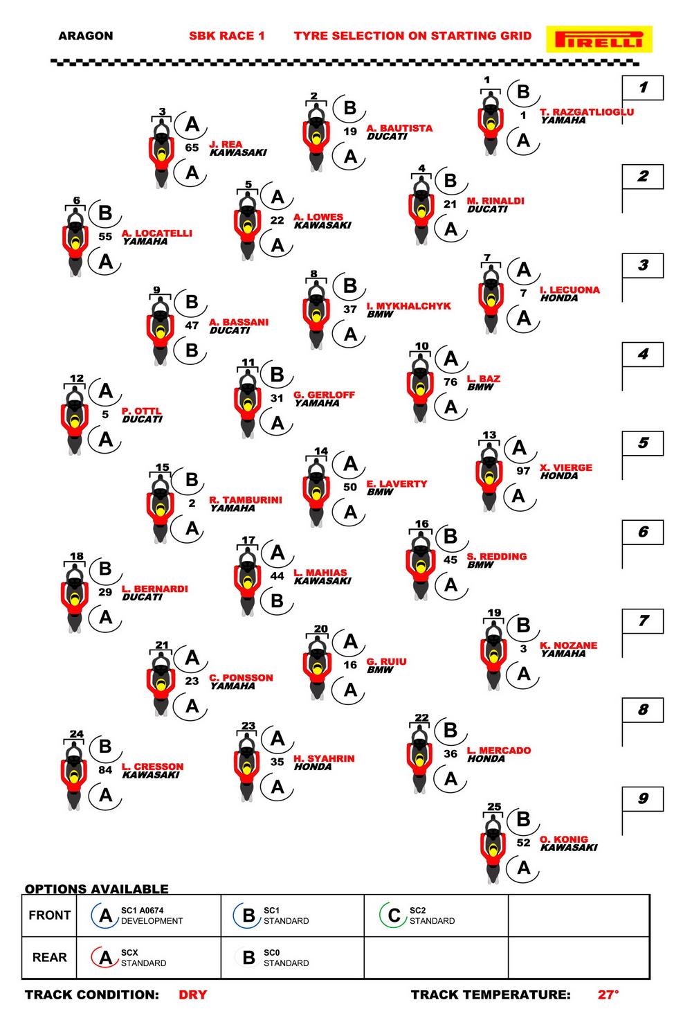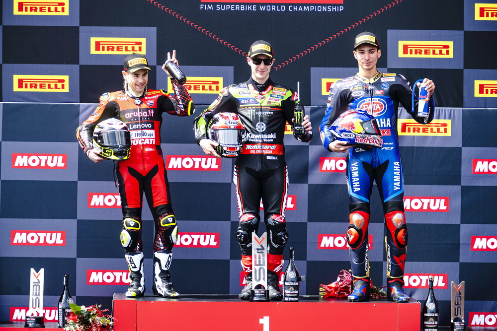 WSB/WSBK 級(jí)別,賽前的 Super Pole 超級(jí)排位賽,應(yīng)屆世界冠軍、駕駛 1 號(hào)車的土耳其車手拉格里奧盧(Toprak Razgatlioglu)以 1 分 48.267 秒、破記錄(原來的記錄是 1 分 49.62 秒)的最佳圈速,奪得了排頭位出賽。駕駛 19 號(hào)車、今年重返杜卡迪的捌弟(Alvaro Bautista,巴迪斯塔),和 65 號(hào)車的雷亞(Jonathan Rea)分別占據(jù)了發(fā)車位置第一排的另外兩個(gè)席位。