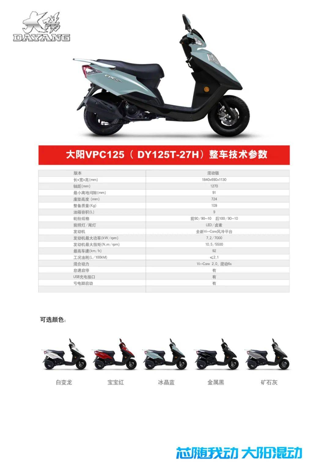 還有三款小踏板車型,也是大家常說的通路車,分別為VPG125/VPC125/VPJ125,這三款車都以“花少錢享受高科技的通勤踏板車為賣點”,最大的亮點就是上述三款車均搭載了Vi-Core 2.0動力平臺,同樣具備6s的混動加持,這算是通路踏板車中僅此一家的存在。