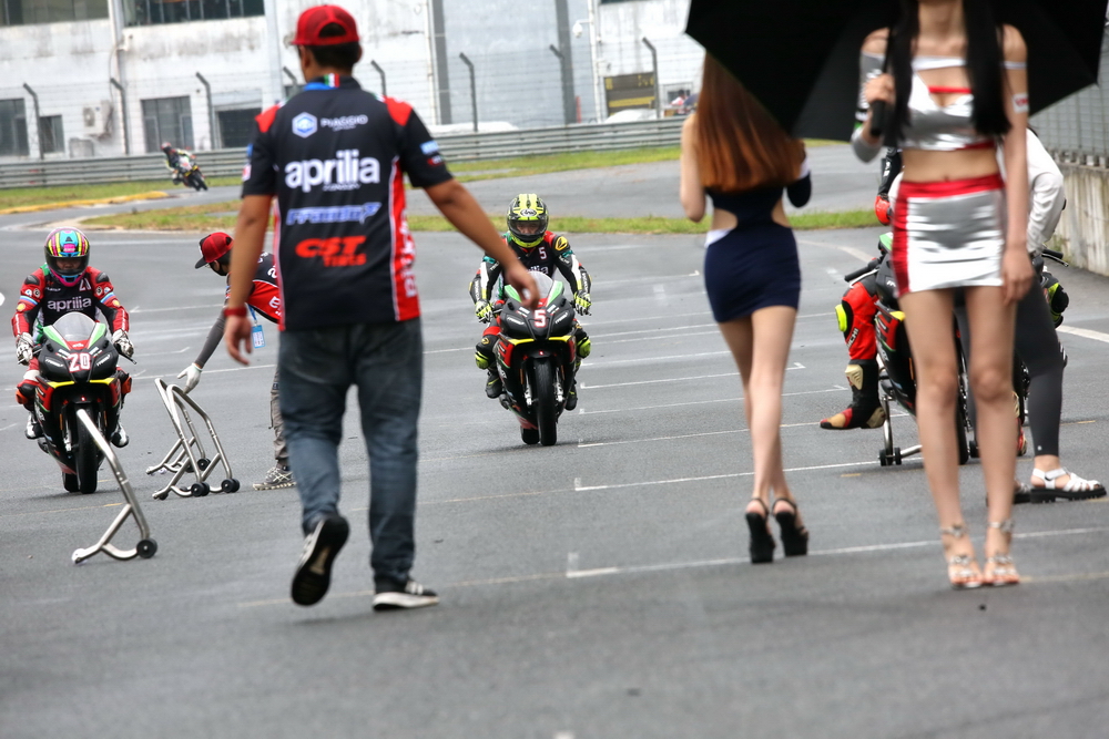 aprilia GPR250R 統(tǒng)一賽第二節(jié)比賽,在周日的午后兩點多進行。天空飄起了雨花,GPR250R 賽車都全部換上了雨胎。