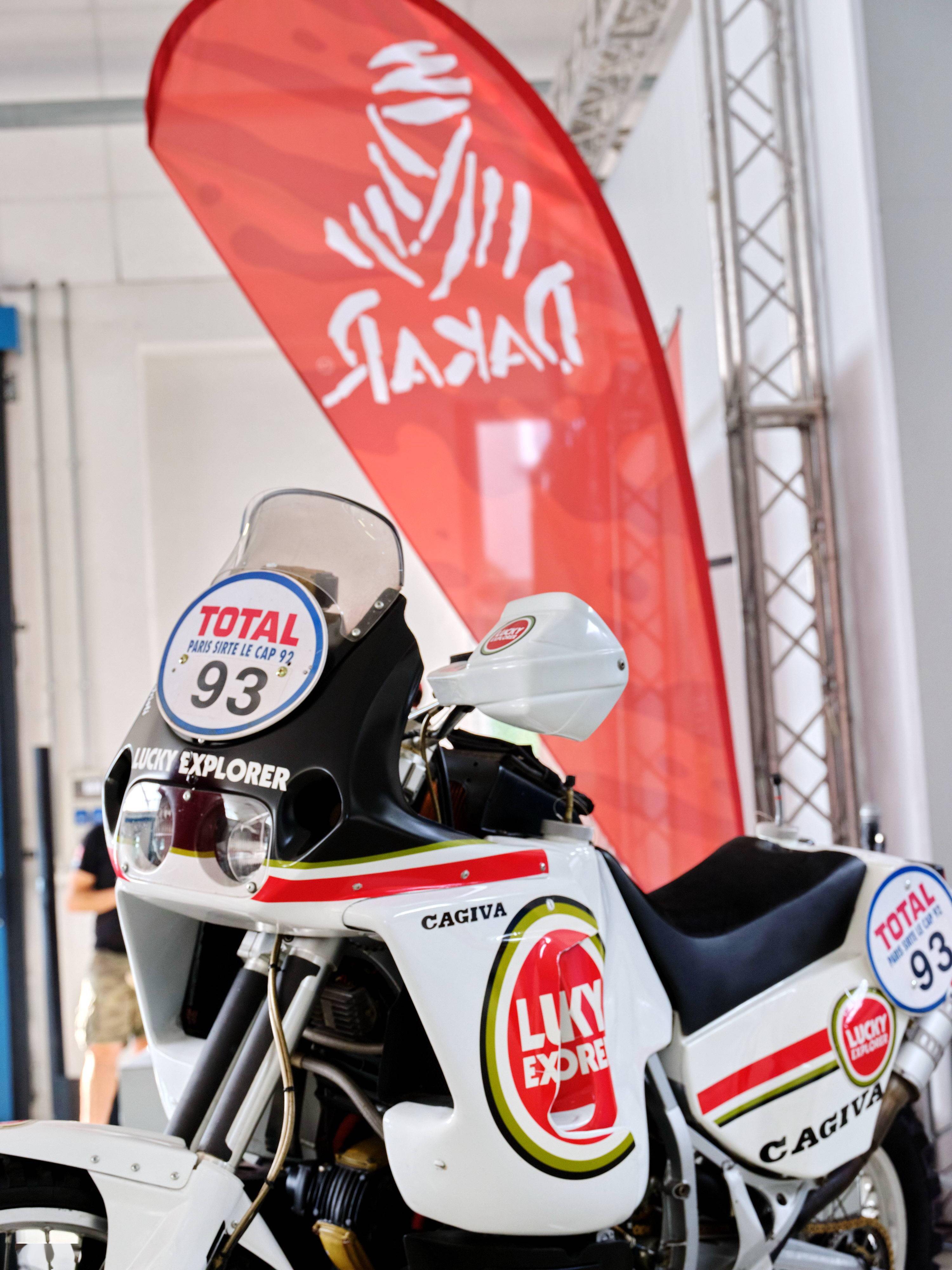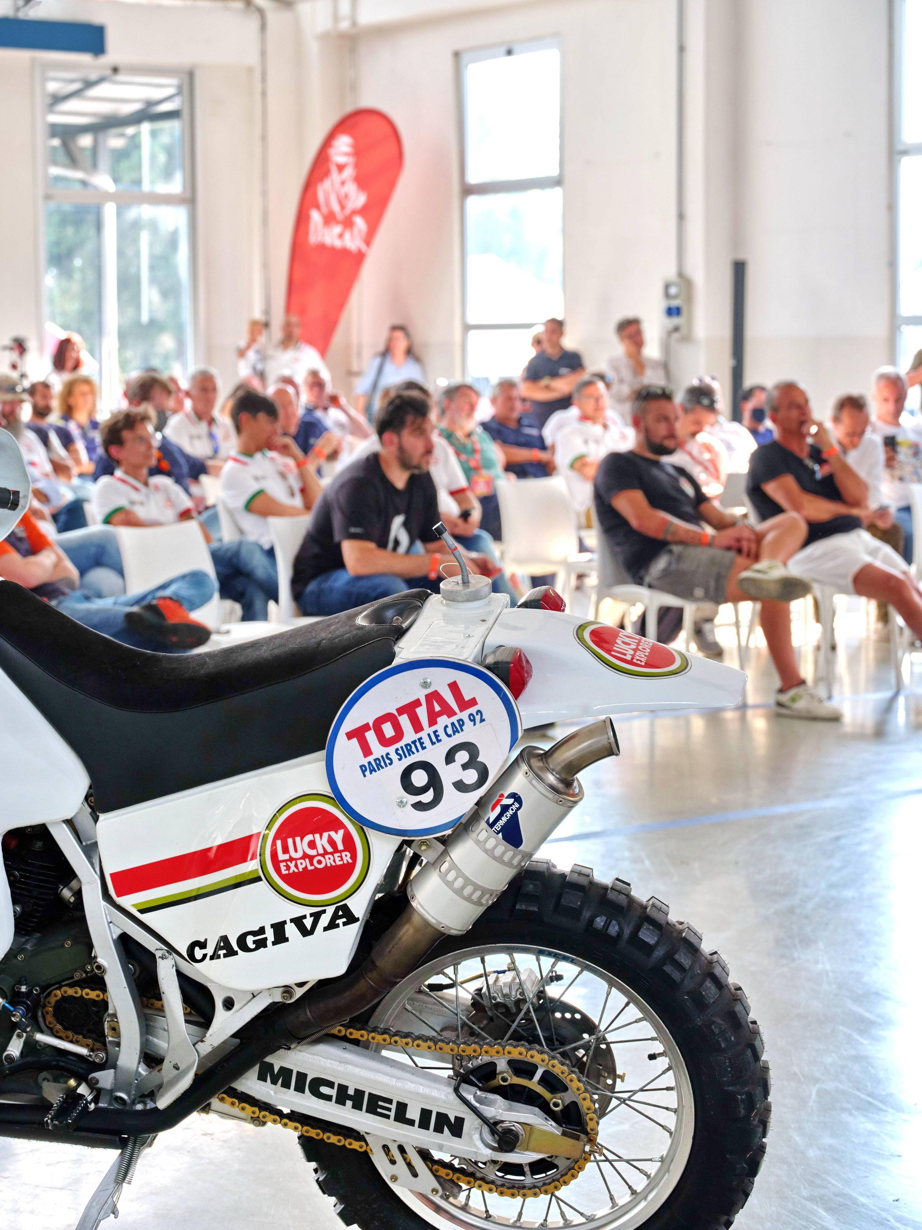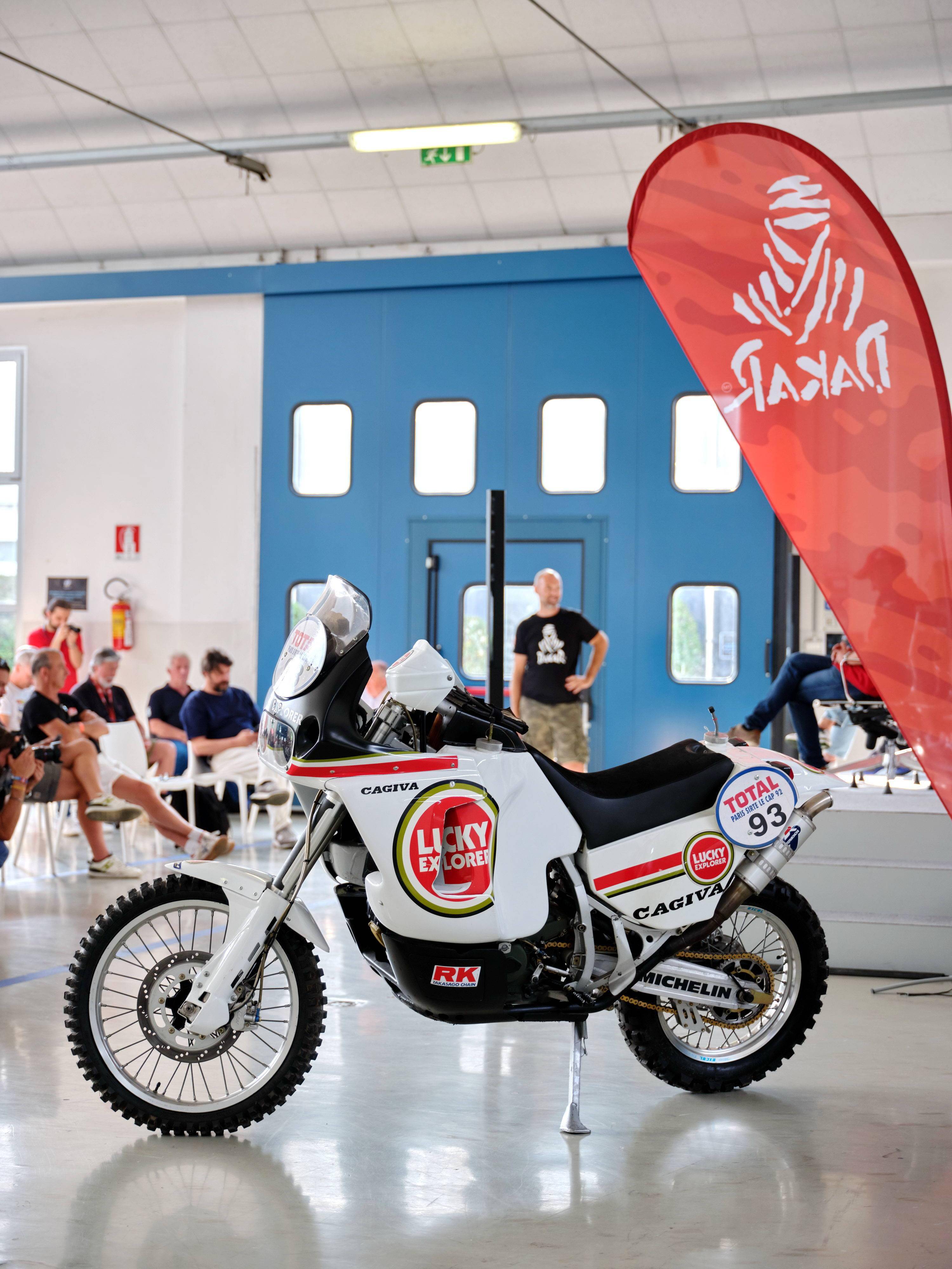 活動中,廠方展示了他們旗下子公司品牌 Cagiva 卡吉瓦在上世紀(jì)九十年代、兩次(1990 年和 1994 年)奪得巴黎 - 達(dá)喀爾拉力賽摩托車組冠軍的賽車 Elefant 900,而當(dāng)時的參賽車隊名為 Lucky Explorer “ 好彩探索者 ”,車手是來自意大利的奧里奧利(Edi Orioli)。