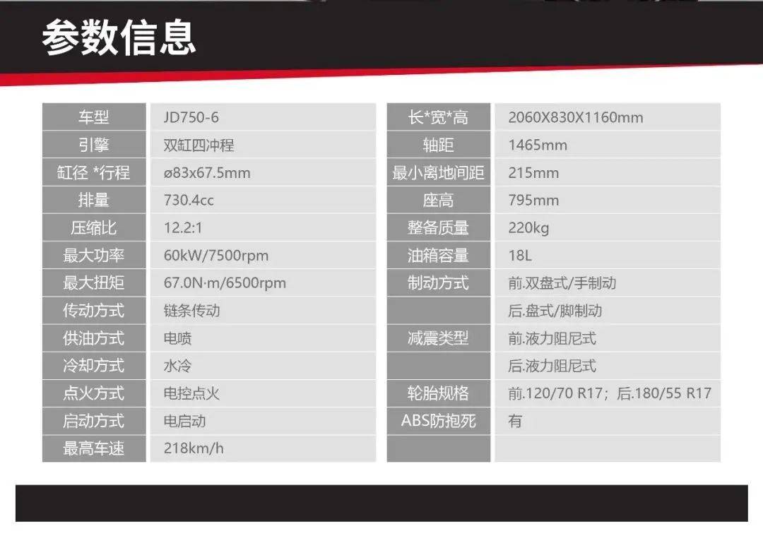 傑750是杰迪機車積極參與國際合作并自主研發(fā)的一款GT風(fēng)格的運動旅行車,也是杰迪面向民用市場非常經(jīng)典的一款里程碑產(chǎn)品。它的外觀設(shè)計充滿了美感和力量感,一體式高位車把和坐墊讓坐姿相對直立舒適;寬大的車頭和整流罩,為上半身和膝部提供良好的風(fēng)阻保護效果。在車架部分采用了一體成型低壓鑄造鎂鋁合金雙翼梁車架,整個車架重量僅為9.3kg,加上同樣的鎂鋁合金后搖臂,使得整備質(zhì)量僅為208kg。在動力方面,搭載英國里卡多Ricardo設(shè)計研發(fā)和杰迪生產(chǎn)的730cc直列雙缸水冷發(fā)動機,最大功率52.5kW,最大扭矩62Nm,壓縮比高達12.5:1。百公里加速實測數(shù)據(jù)為4.3秒,最高時速可達208km/h。