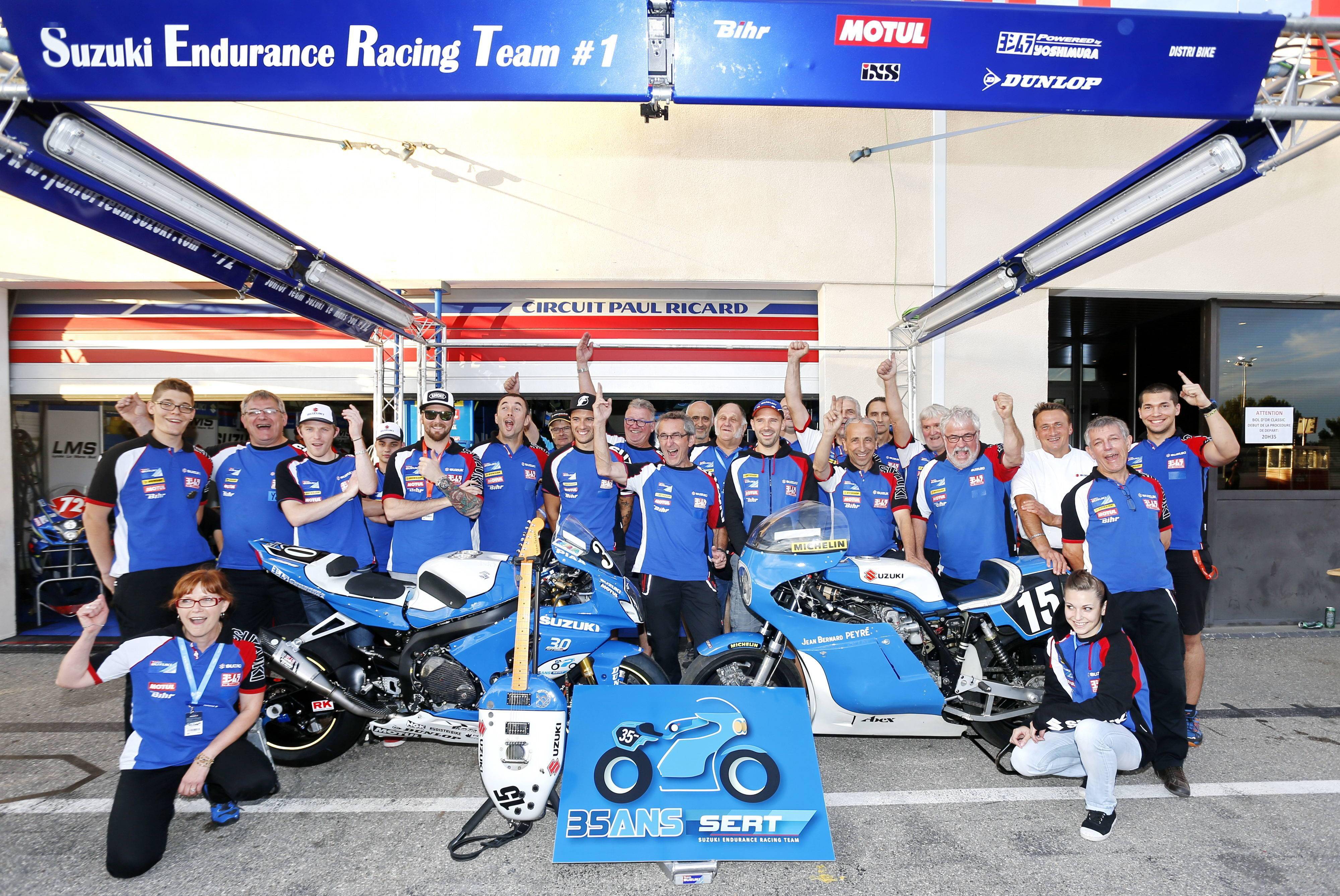 下圖:奪得 2015 年度 EWC 世界冠軍的 SERT 車隊(duì)(資料圖片)。這一年,是 SERT 車隊(duì)參賽的第三十五周年,同時(shí)也是 Suzuki 當(dāng)年的超級跑車 GSX-R750 上市三十周年。