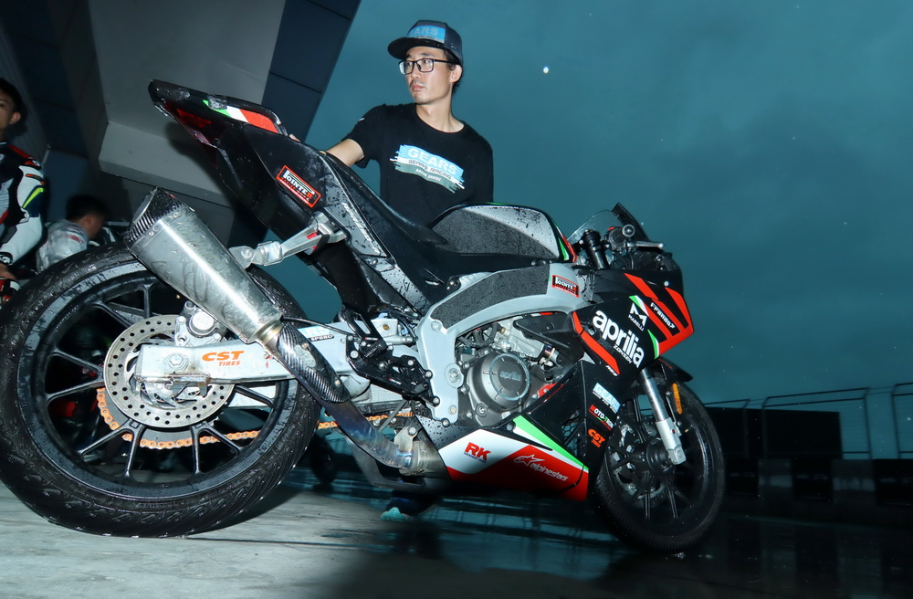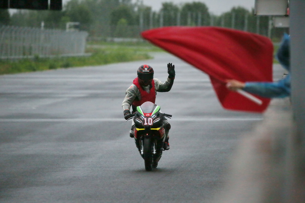 周末的時(shí)候(七月 16 日),菏澤當(dāng)?shù)叵缕鹆藘A盆大雨,早上進(jìn)行的熱身練習(xí),在濕滑的路面之下進(jìn)行。原定午后兩點(diǎn)多開(kāi)始的 aprilia GPR250R 統(tǒng)一賽第一回合決賽,也因?yàn)閻毫拥奶鞖庾屌艿莱錆M積水而被推遲。