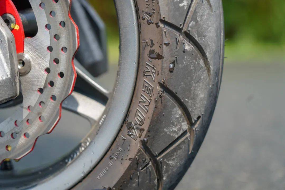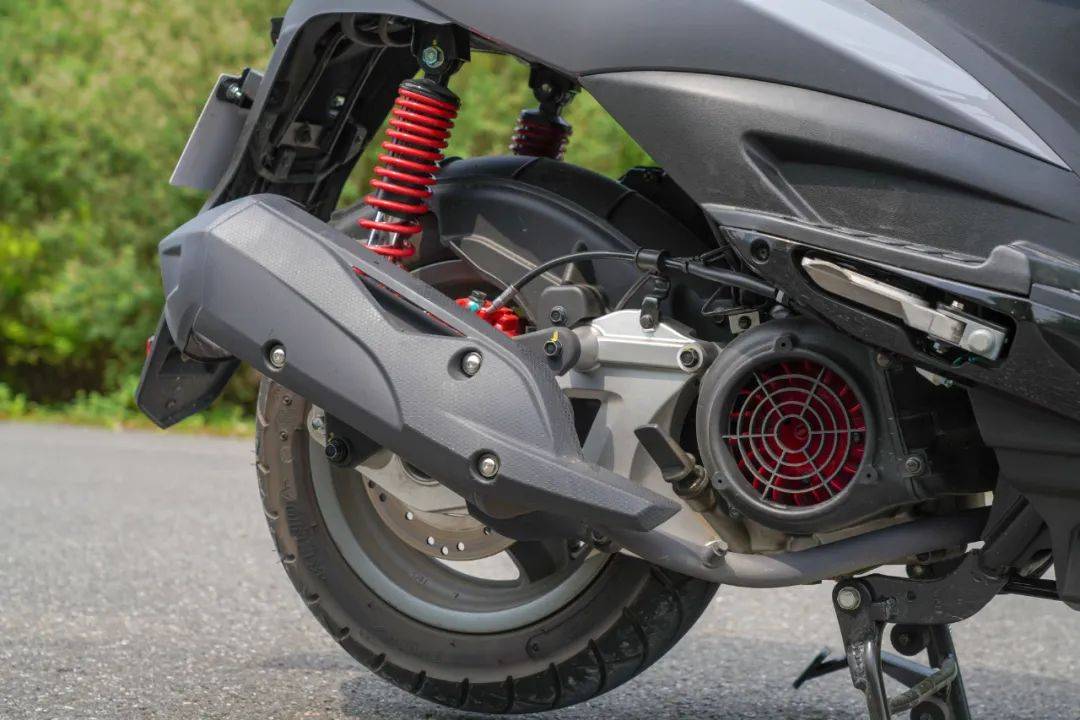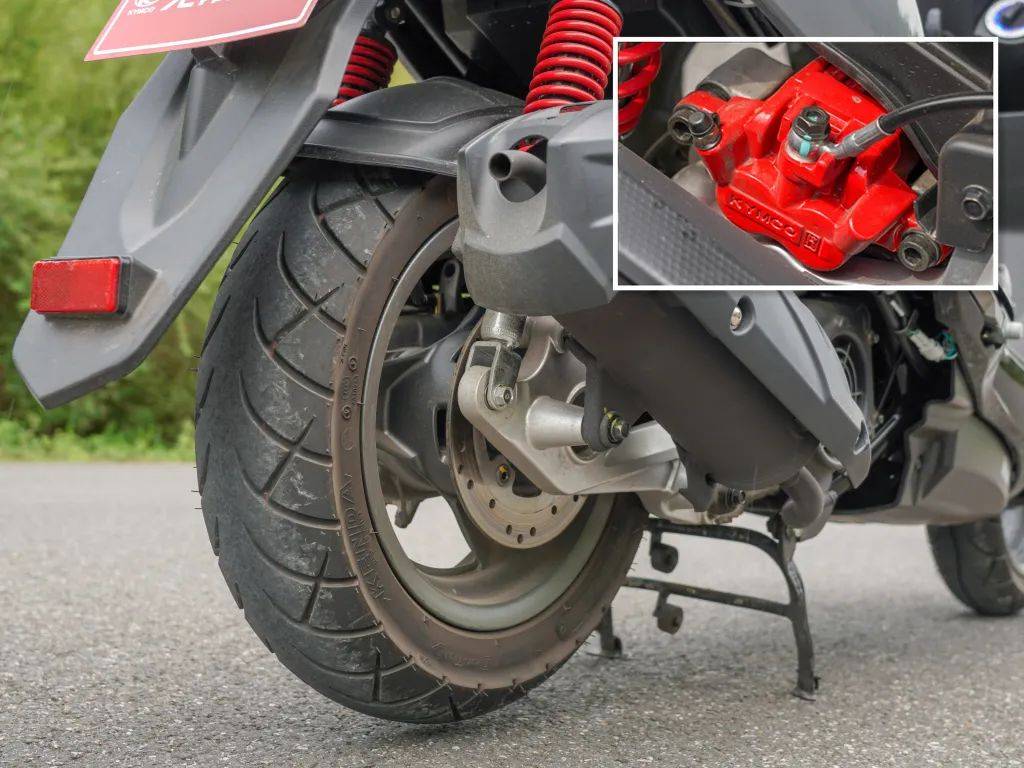行走系統(tǒng)部分,采用前正置不可調(diào)減震搭配后三段預(yù)載可調(diào)雙槍減震;前110-70-12后130-70-12尺寸,配備建大品牌輪胎。
