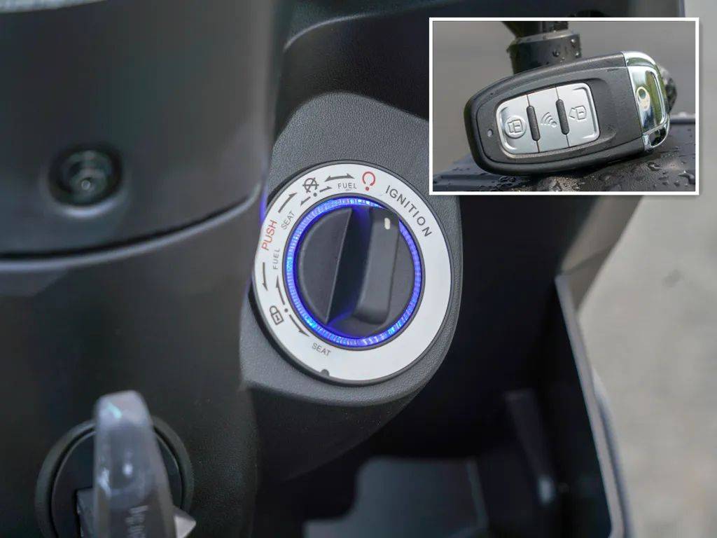 此外,光陽還給新彎道150配上了相當(dāng)時髦的無鑰匙啟動系統(tǒng),而這套無鑰匙啟動的邏輯有些特別——每次啟動前需要掏出遙控器按下解鎖鍵(此時鑰匙旋鈕必須位于熄火位置,否則遙控解鎖無效),待中控鎖外圈指示燈亮起黃色代表無鑰匙系統(tǒng)進(jìn)入待機(jī)狀態(tài),此時順時針擰動旋鈕到點(diǎn)火位,指示燈亮起藍(lán)色,整車通電,可正常點(diǎn)火啟動。騎行結(jié)束后,將中控旋鈕逆時針擰回熄火位置,此時不會立即斷電,還需再掏出遙控器按下鎖定鍵才能將車輛立即斷電。