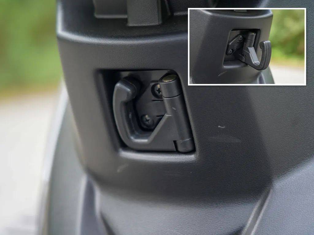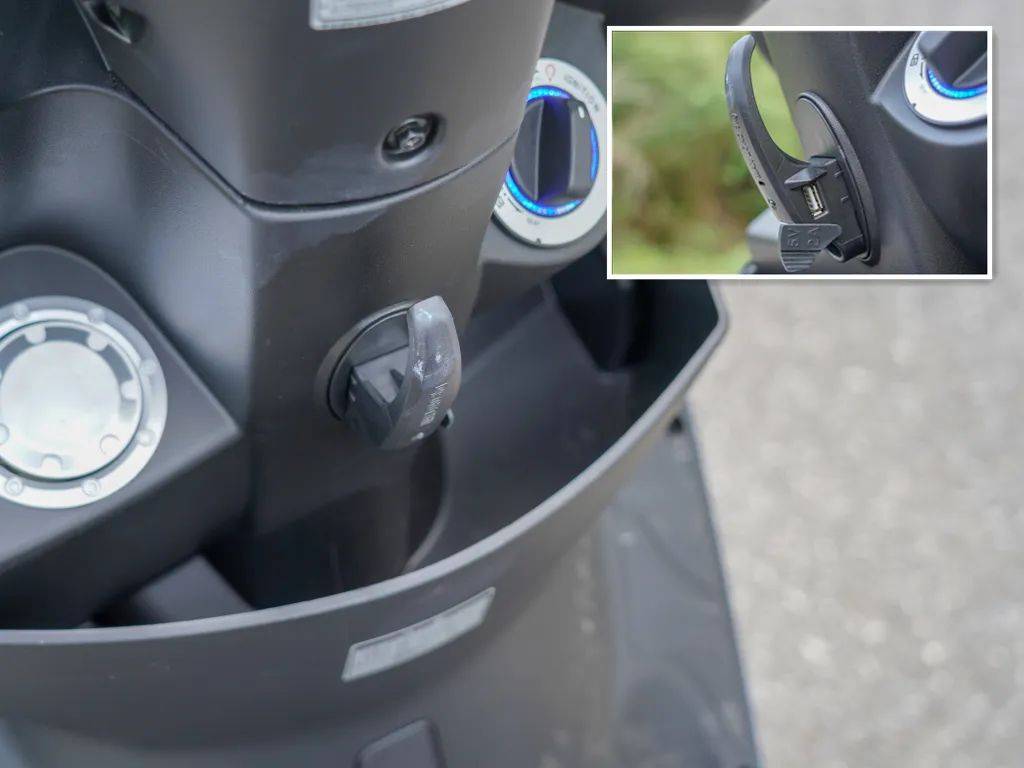 其次前置儲物箱容積也相當(dāng)可觀,并且新彎道150還提供兩個置物掛鉤,配合平踏設(shè)定可以進(jìn)一步拓展車輛載物能力。 前儲物箱上方的置物掛鉤還巧妙地融合了USB接口,可以將手機(jī)等用電設(shè)備直接放在儲物箱中,相當(dāng)方便。