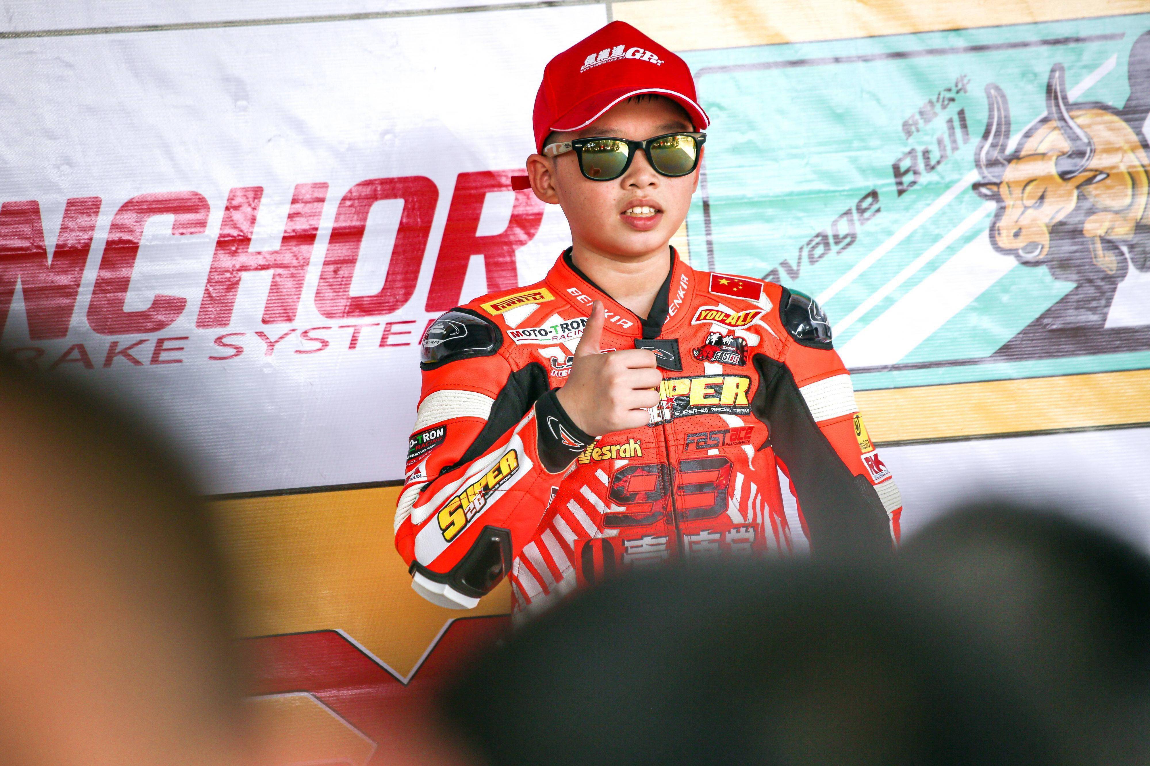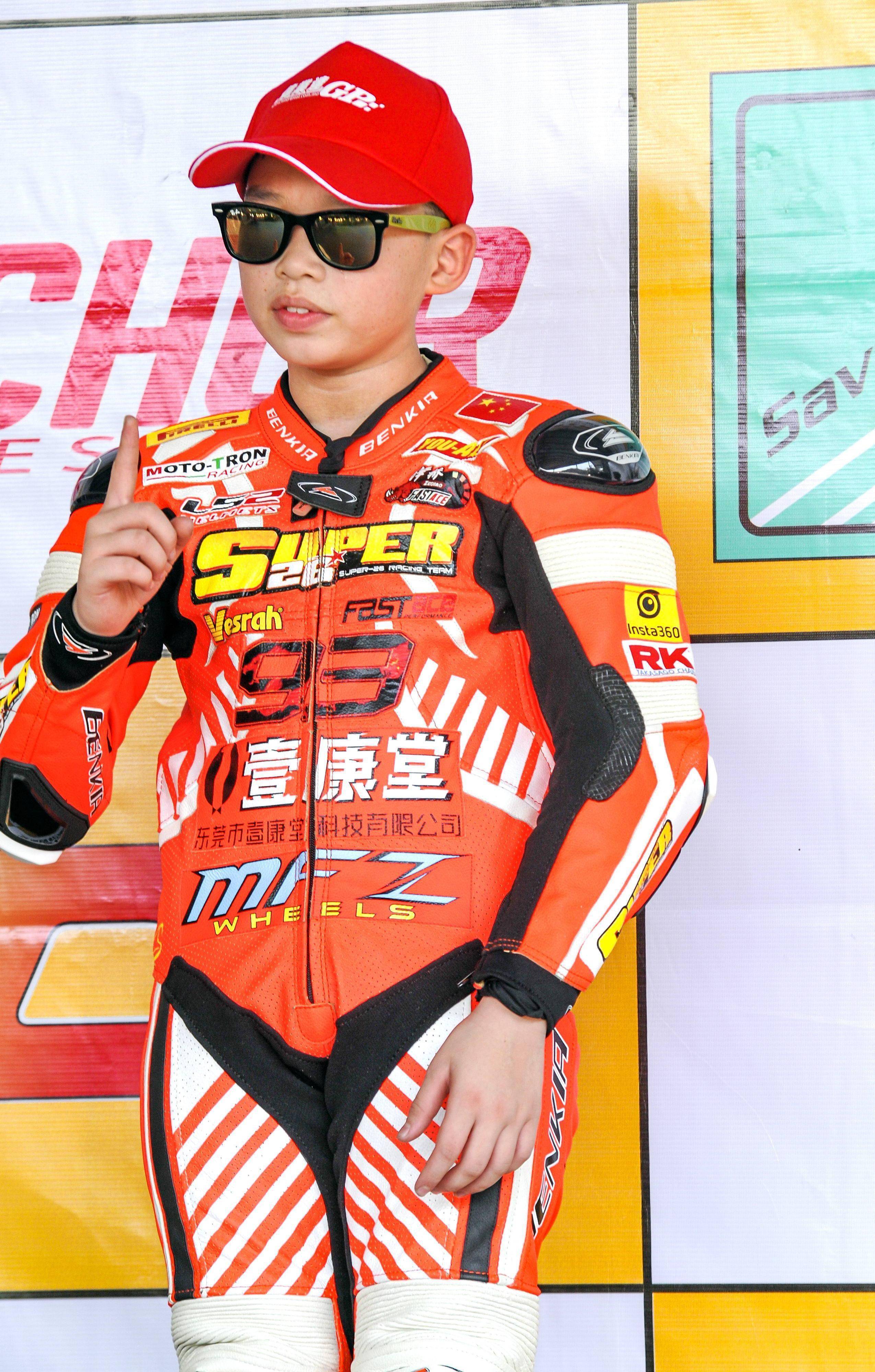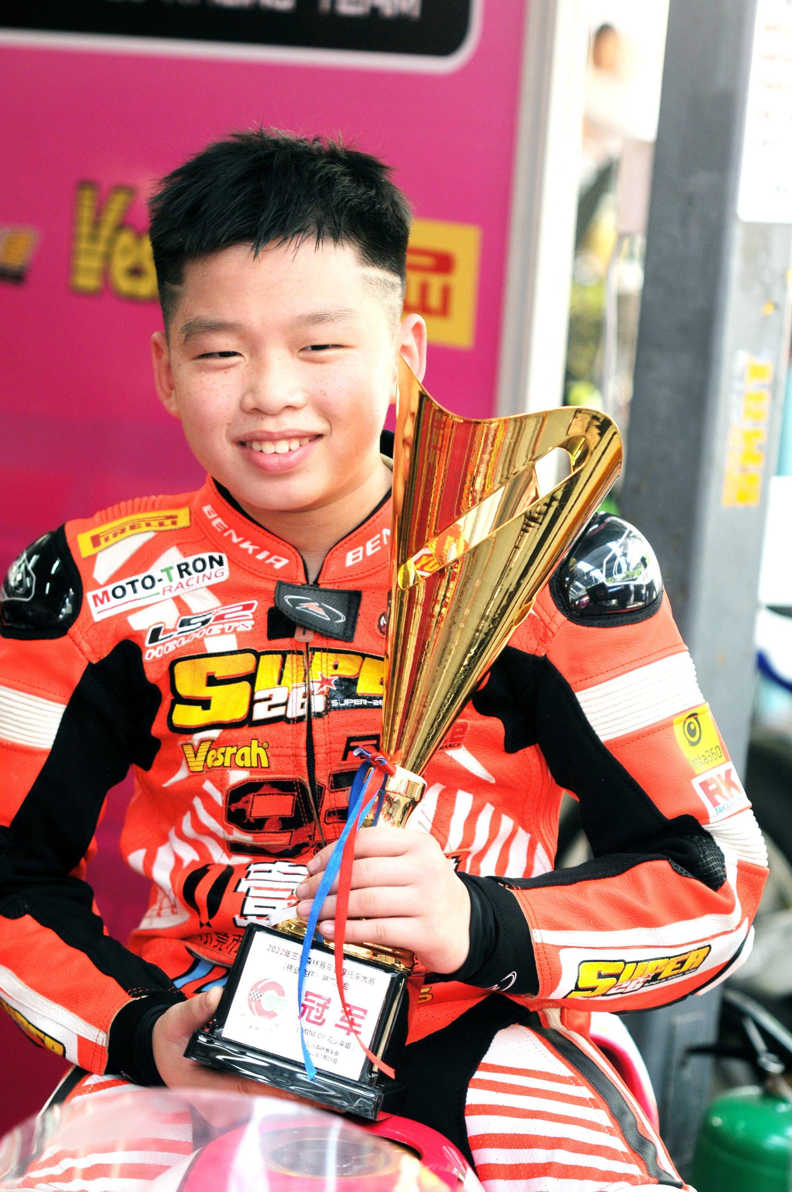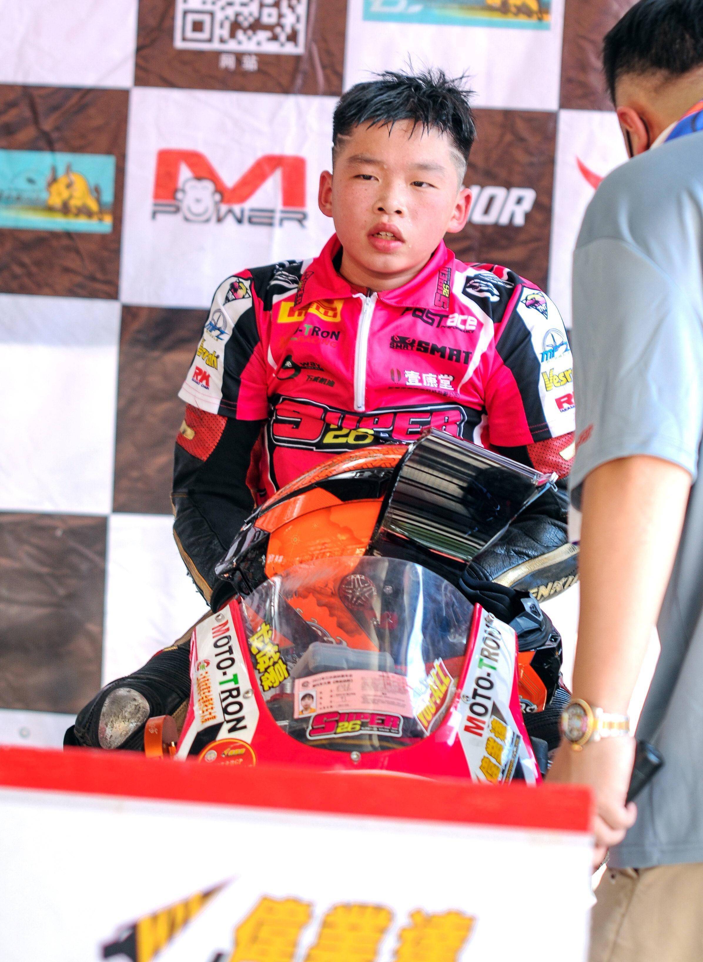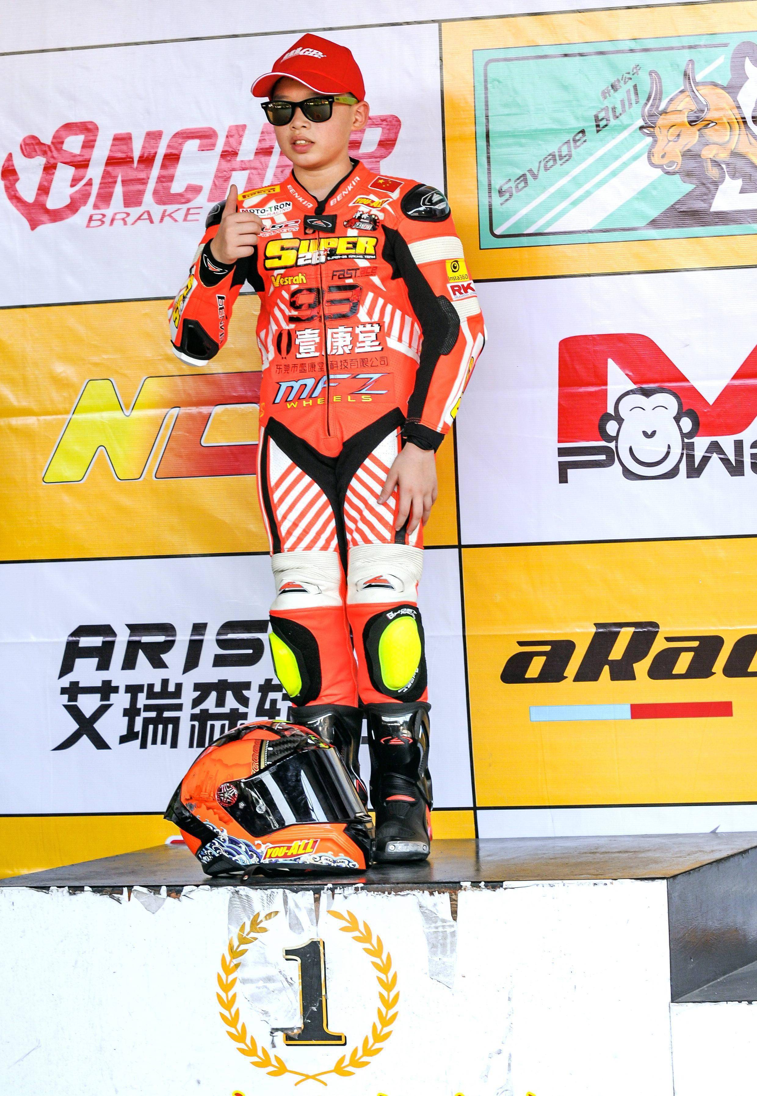 今年 11 歲的龍俊豪,從去年的小童賽道體驗(yàn) A 組、升級(jí)到今年新設(shè)立的 MiniGP 150 公開組 青少年組。憑借著非常穩(wěn)定而且快速節(jié)奏,他在兩節(jié)比賽里分別奪得了第一和第二名,綜合兩節(jié)的成績(jī),他最終奪得了本回合 MiniGP 150 公開組青少年組的冠軍。這是他今年升級(jí)以來、首次拿到本組比賽的冠軍。
