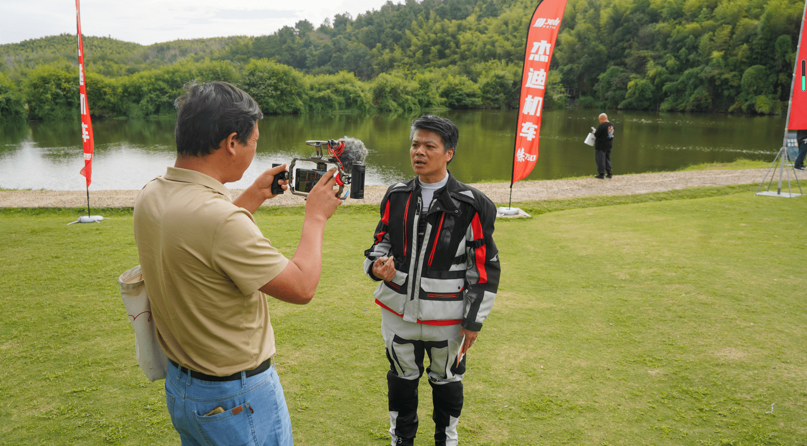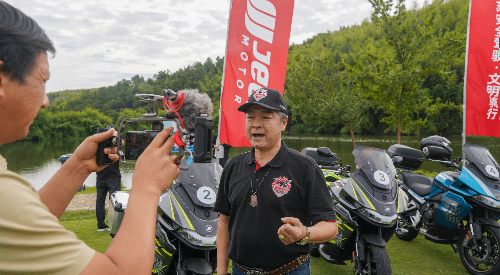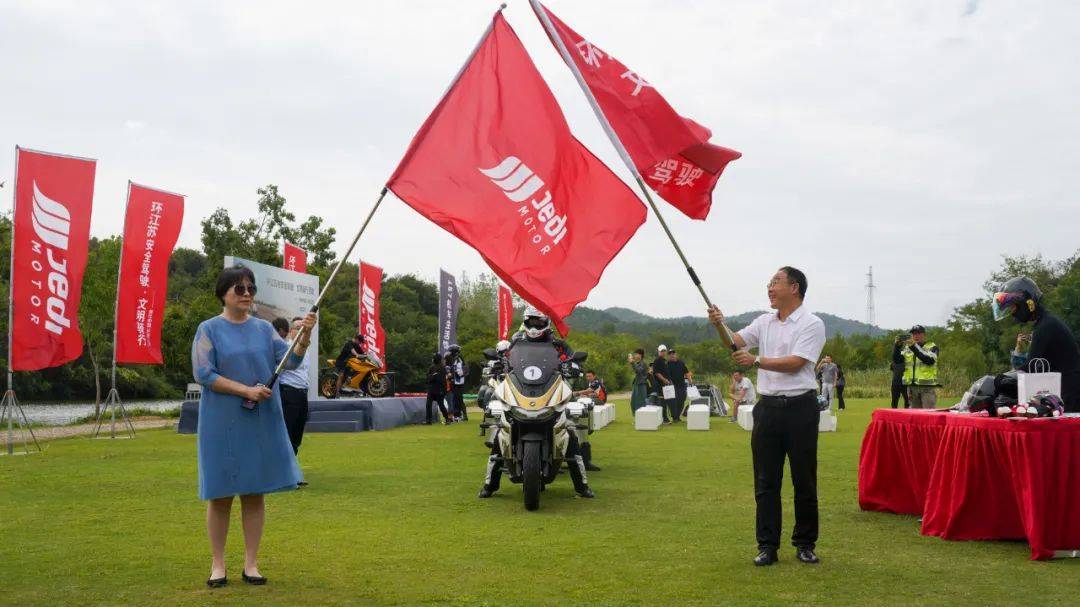 江蘇省汽摩運(yùn)動(dòng)聯(lián)合會(huì)秘書(shū)長(zhǎng)姚亞敏女士與臧傳統(tǒng)先生共同為杰迪K750揭幕,亮相本次出發(fā)儀式。