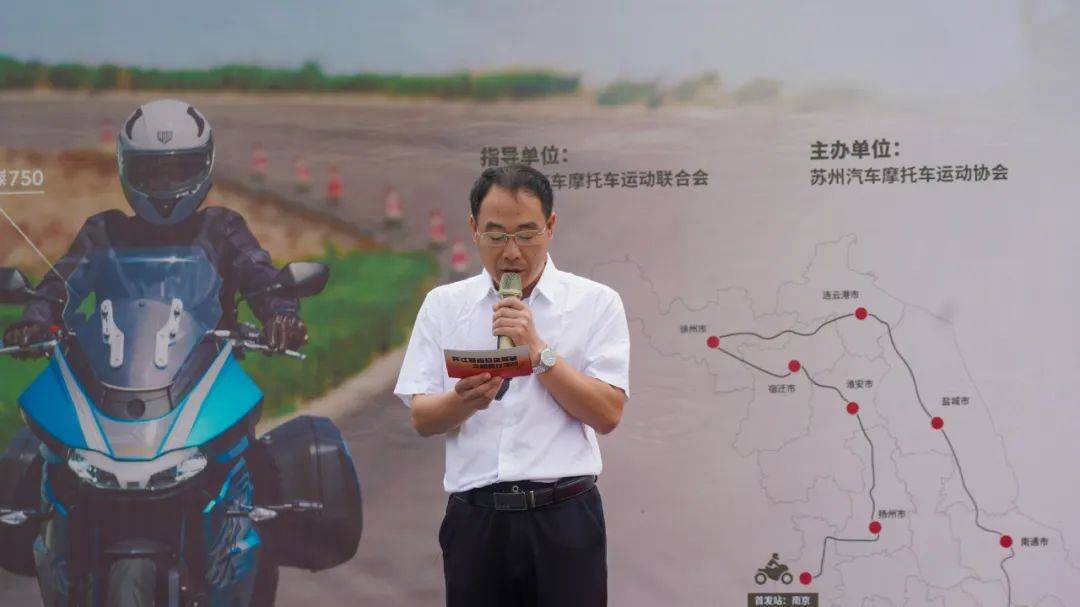 活動(dòng)儀式首先由江蘇省汽摩運(yùn)動(dòng)聯(lián)合會(huì)副會(huì)長(zhǎng)王一平先生致辭,他高度肯定了本次騎行活動(dòng)的意義,并倡導(dǎo)大家時(shí)刻要安全駕駛、文明騎行。