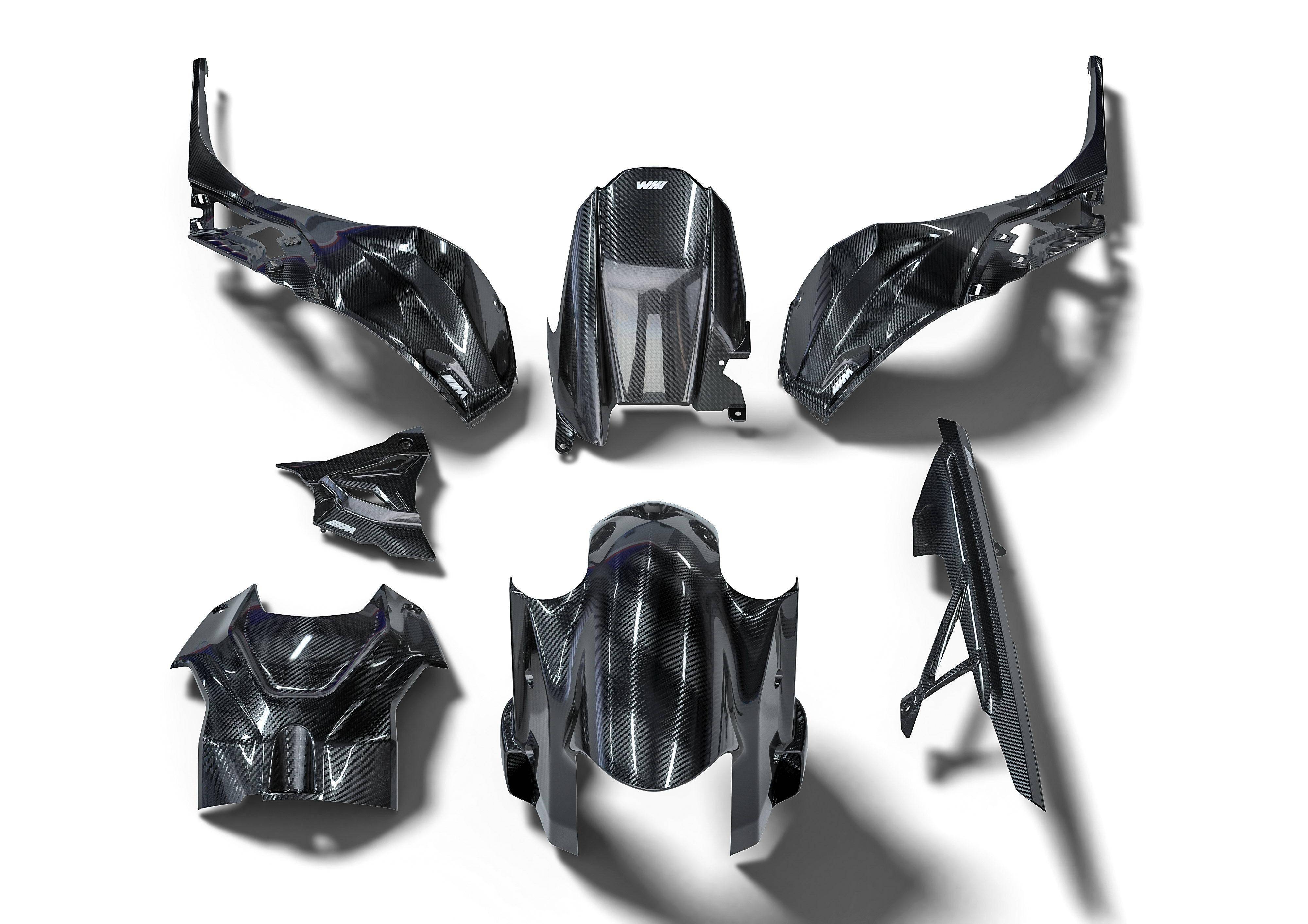 2、碳纖維制、集成了前卡鉗冷卻導(dǎo)流設(shè)計的前輪擋泥板;