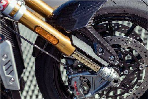 在引擎性能的提升之下,凱旋也替SPEED TRIPLE 1200 RS用上頂級(jí)好料的硬件規(guī)格,車(chē)架使用雙翼梁式鋼管車(chē)架,配鋁合金鋼管副車(chē)臺(tái); 前懸掛使用Öhlins NIX30 43mm全可調(diào)倒立式前叉,配上后TTX36全可調(diào)中置單槍后避震; 剎車(chē)采用Brembo Stylema輻射卡鉗配320mm浮動(dòng)雙碟,后雙活塞卡鉗配220mm單碟; 輪框則是采用前后17寸的鋁合金鑄造輪圈。