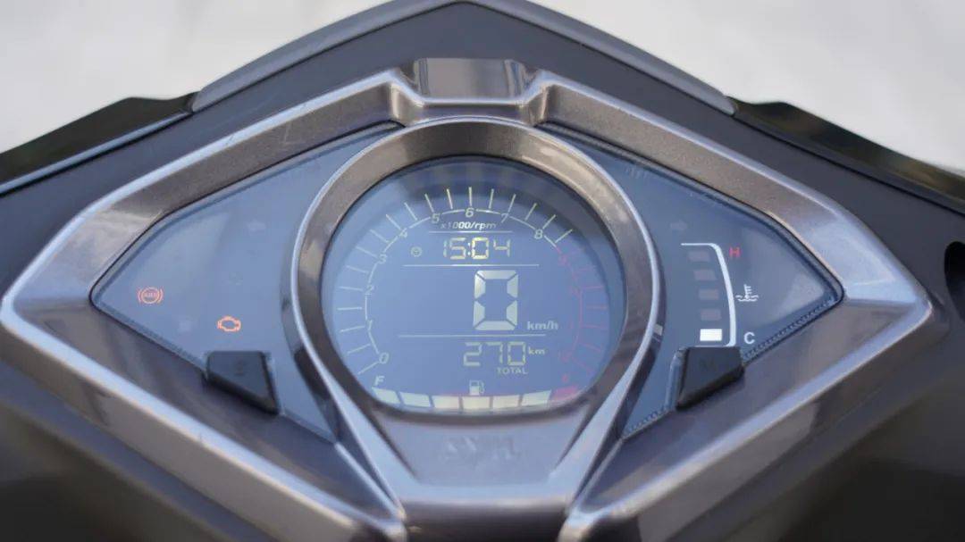 很喜歡這塊儀表,液晶儀表雖然跟不上目前主流的TFT彩屏,好在顯示信息夠充分,尤其是獨(dú)立顯示的轉(zhuǎn)速表,高達(dá)12000rpm的表頭,看著就令人血脈僨張,印象深刻,左側(cè)的常規(guī)顯示,譬如故障燈,ABS指示燈,油量顯示,轉(zhuǎn)向燈,雙閃危險(xiǎn)警示燈,側(cè)踢熄火指示燈的加入,更人性化,體貼,這個(gè)設(shè)計(jì)滿分。