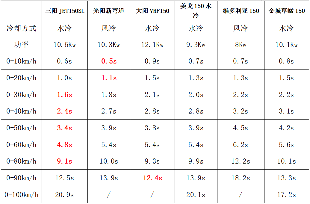 這次為測到零百加速成績,特意找了條車少的省道做測試,最終測得零百加速為20.9秒。從下面的對(duì)比表可以看出,JET150SL在最末端的提速明顯放緩了,但在20-90速度段,基本都領(lǐng)先其他幾款車型,0-20則是新彎道150領(lǐng)先。