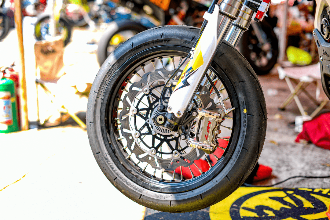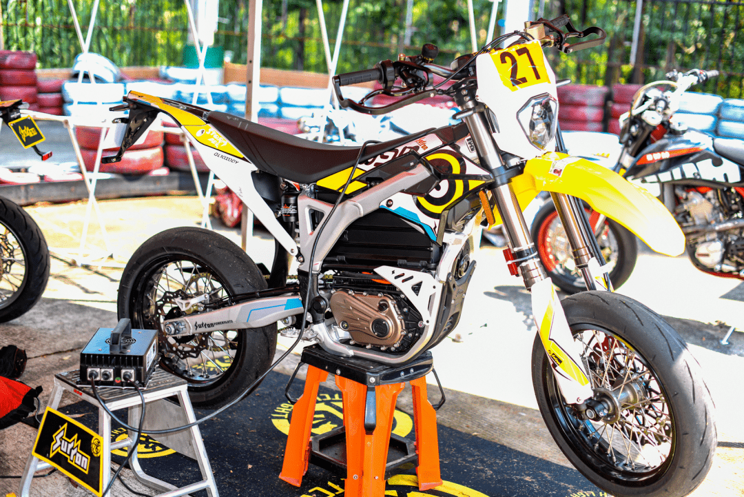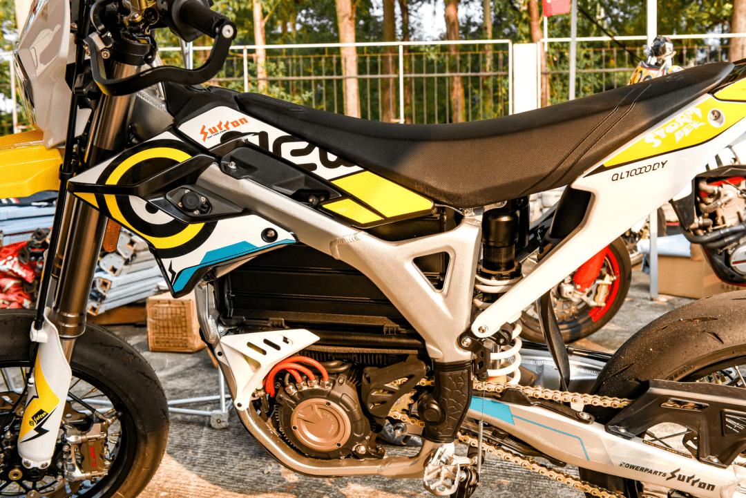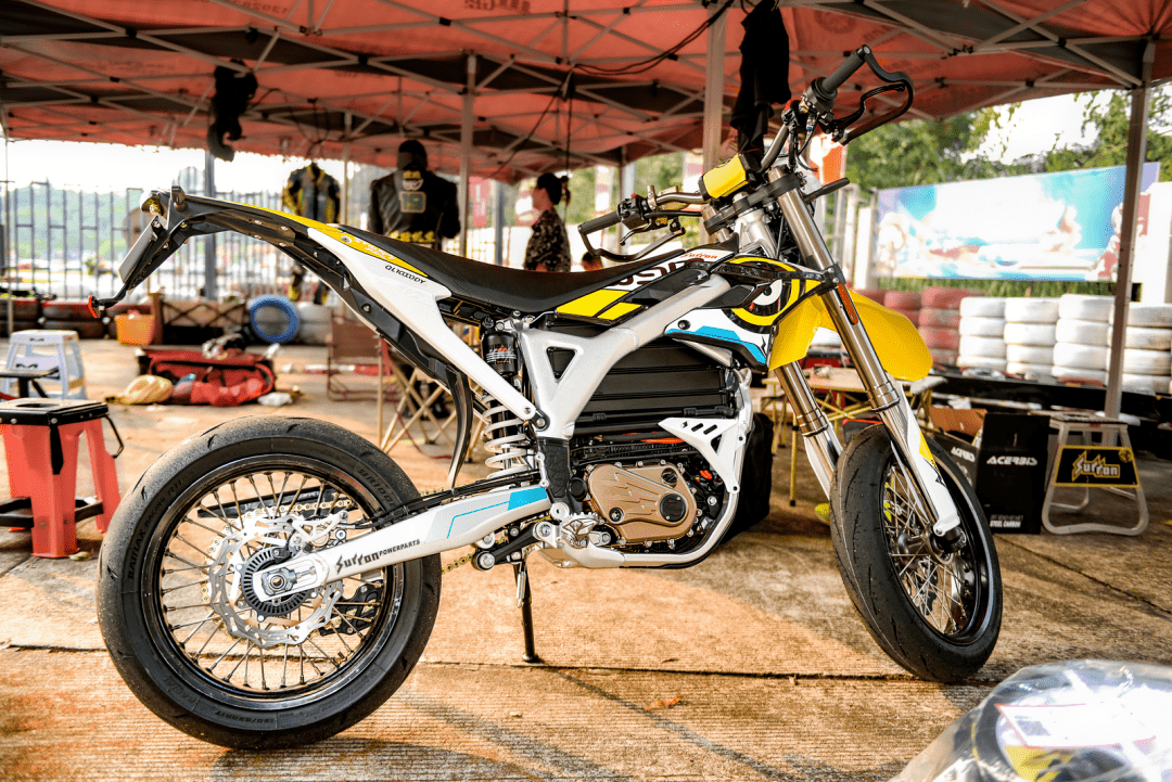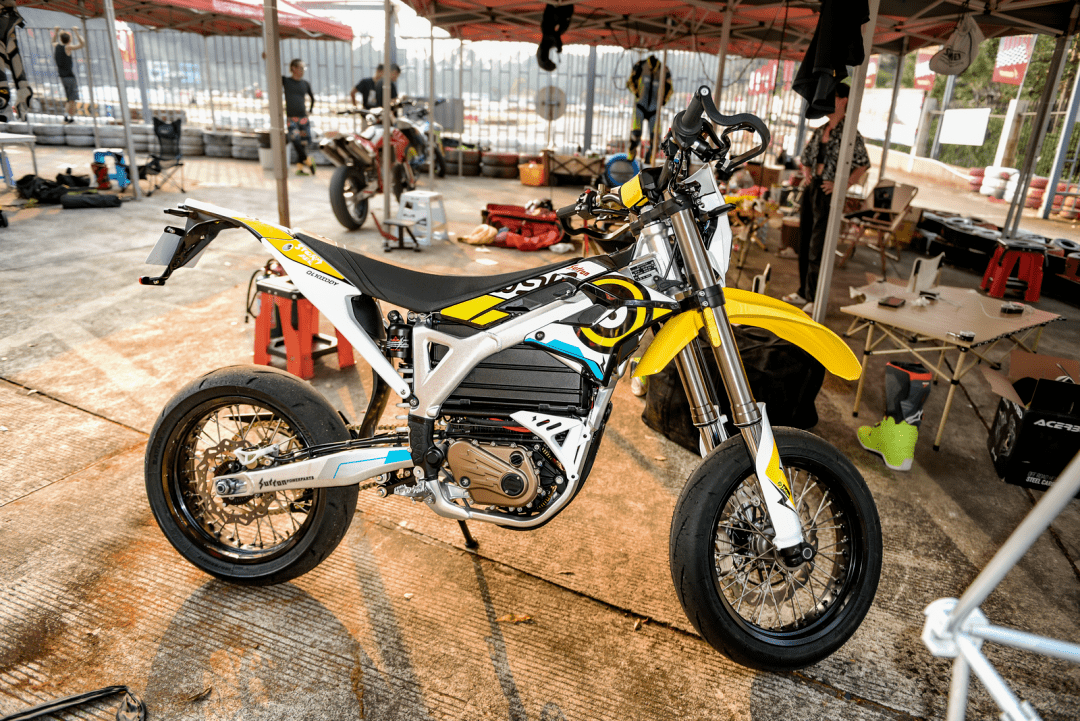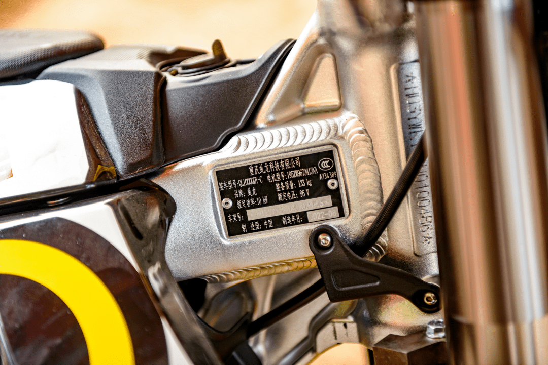 滑胎公開組的比賽里,出現(xiàn)了一輛新的賽車:Surron 虬龍 QL10000 DY-C 暴蜂。現(xiàn)場看到這臺電動賽車,采用了中置電機(jī)的的布局,其標(biāo)識顯示電機(jī)的額定輸出功率為 10 kw,電池輸出電壓為 96V(偉業(yè)達(dá) GP 里面的電車公開組、賽例的最大電壓輸出也是限制在 96V 以下)。車體使用一副鋁合金雙翼樑式的車架,纖薄的車身設(shè)計,17 英寸的前后輪框、配備了普利司通的 Battlax Racing R11 競技輪胎(前 120/600R17、后 150/620R17)。