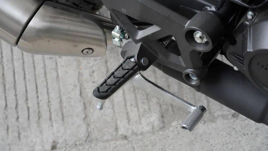 腳踏質(zhì)感是沒問題的,但是有一點需要注意,就是左側(cè)換擋桿位置;換擋桿是低于腳踏較多的, 由于騎行姿勢比較直立,在穿著馬丁靴這種較厚的鞋時,換擋時腳面會刻意繃直,容易產(chǎn)生疲勞,在使用時推薦調(diào)整到適當角度。