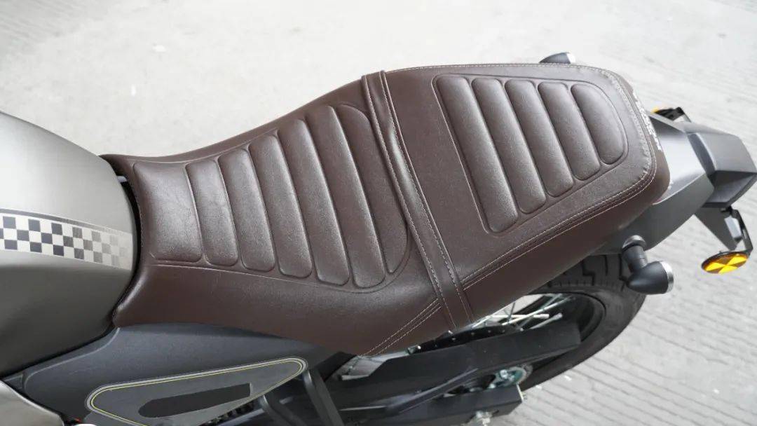 與復(fù)古車的平直坐墊不同,一體式坐墊,主座位是向下凹陷的,在油箱末端有收窄過渡,而主座位置很寬。座高785mm,在騎行三角上比CB190R要舒展很多,對駕駛者身高的兼容上限有提高。當然,這和油箱兩側(cè)造型也有關(guān)系。