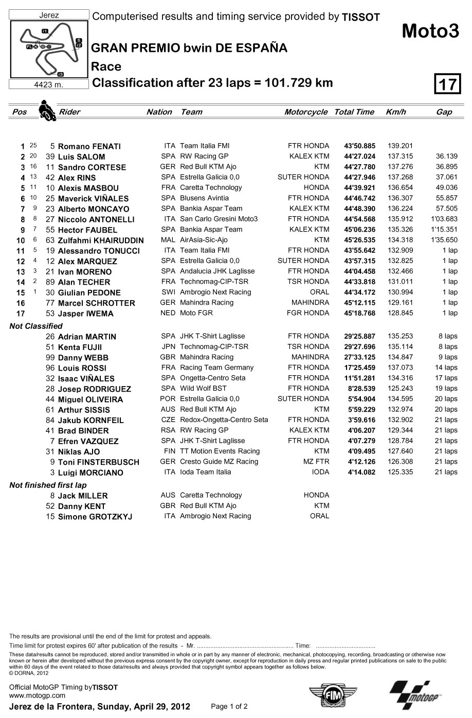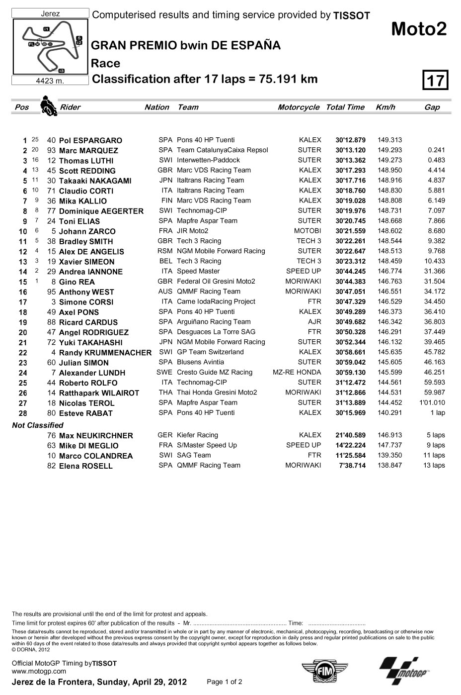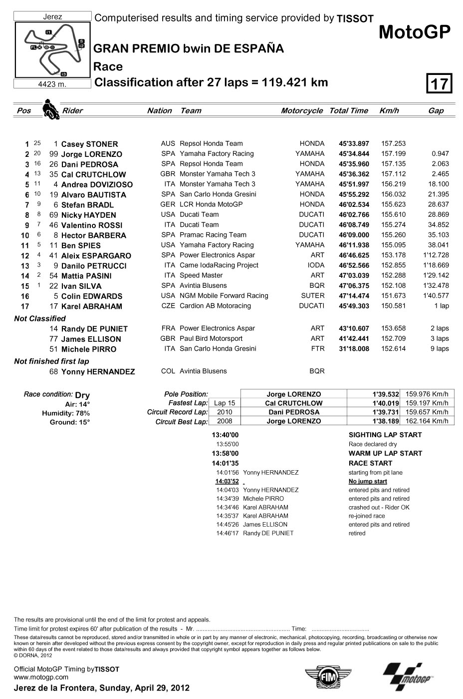 2012年MotoGP錦標(biāo)賽西班牙站-決賽成績表