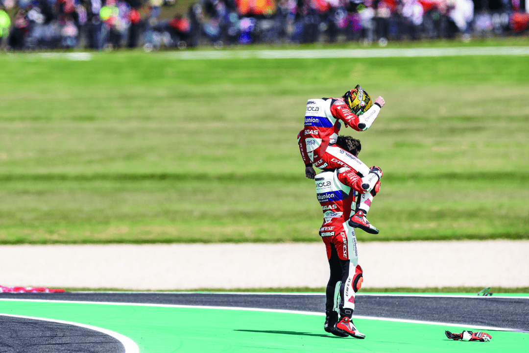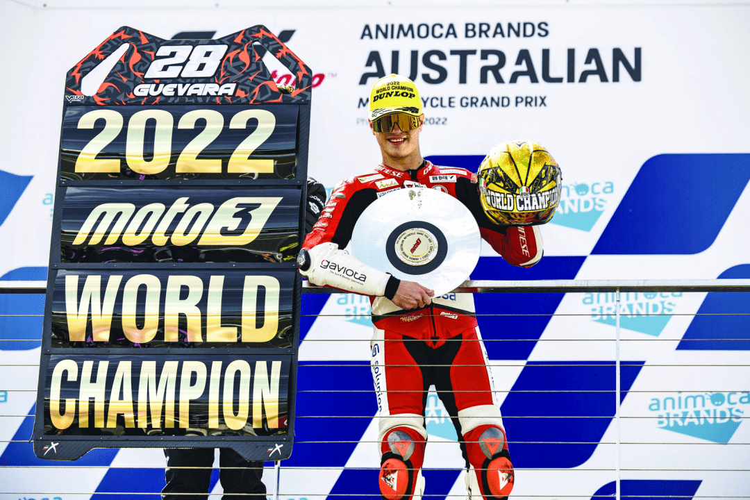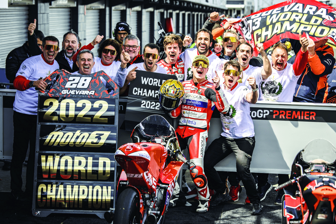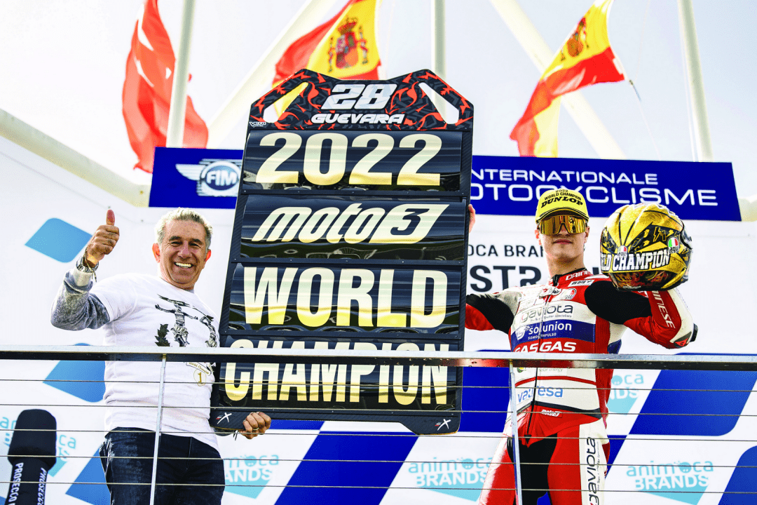 奪得了澳大利亞站的冠軍之后,古瓦拉已經(jīng)獲得了足夠的積分(290 分),提前兩站奪得了 2022 賽季 Moto3 級(jí)別的世界冠軍(車(chē)手年度積分總冠軍)。而這一站比賽里拿到了第三名的加西亞,在積分榜上、從賽前的第三位上升到第二(225 分)。兩人的出色發(fā)揮,讓車(chē)隊(duì)也以 515 分、大幅度的領(lǐng)先優(yōu)勢(shì)(注:暫時(shí)排在第二的車(chē)隊(duì)只有 351 分),提前獲得了今年的車(chē)隊(duì)年度總冠軍。