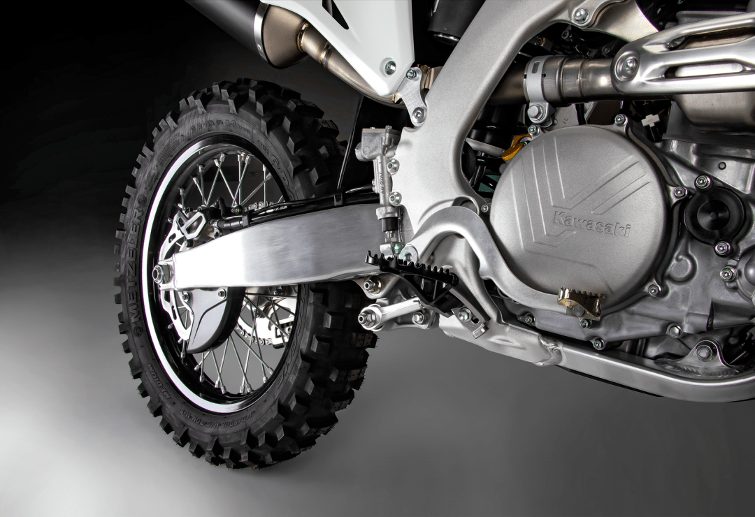 車體采用一副鋁合金制的雙翼樑闊面車架,規(guī)格上與 KX450X 相同(叉芯口徑 49 mm、行程為 305 mm)的倒立式前叉和后減震(行程為 307 mm),前后波浪式剎車碟的制動(dòng)系統(tǒng),前 21、后 18 英寸直徑的輪框,不包括燃料之下的整備重量為 110.2 公斤(KX450X 的整備重量為 111.6 公斤)。