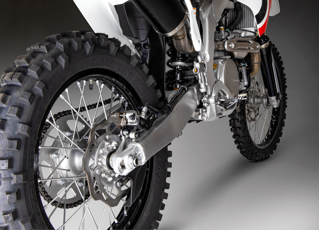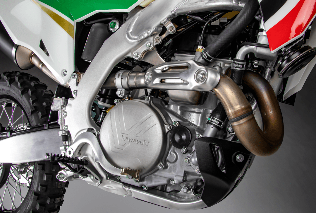 BX450 搭載一副與 Kawasaki KX450X 相同的水冷四沖程單氣缸、DOHC 四氣閥的發(fā)動(dòng)機(jī),缸徑、行程為 96 mm x 62.1 mm,具有 12.5:1 的高壓縮比,排氣量 449 cc,五檔的變速齒輪箱、電啟動(dòng)。比摩塔和 Kawasaki 都沒(méi)有公布這個(gè) 450 平臺(tái)的峰值動(dòng)力輸出數(shù)據(jù),但一般估計(jì)是 60 匹馬力的級(jí)別。