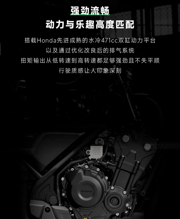 動(dòng)力部分搭載的依然是那臺(tái)我們熟悉的471cc的并列雙缸水冷發(fā)動(dòng)機(jī),最大功率34Kw/8500rpm,最大扭矩43.3Nm/6000rpm,動(dòng)力調(diào)校比CM500激進(jìn)一些,更接近街車CB500F的調(diào)校。