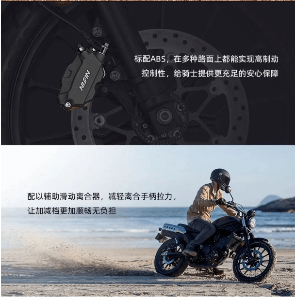 在配置上CL500就顯得有些“樸素”了,LED大燈為CM500同款;一塊小尺寸的單色液晶儀表;日信卡鉗,前單碟配雙活塞卡鉗,配備雙通道ABS系統(tǒng),一切都在踐行本田剛好夠用的原則。