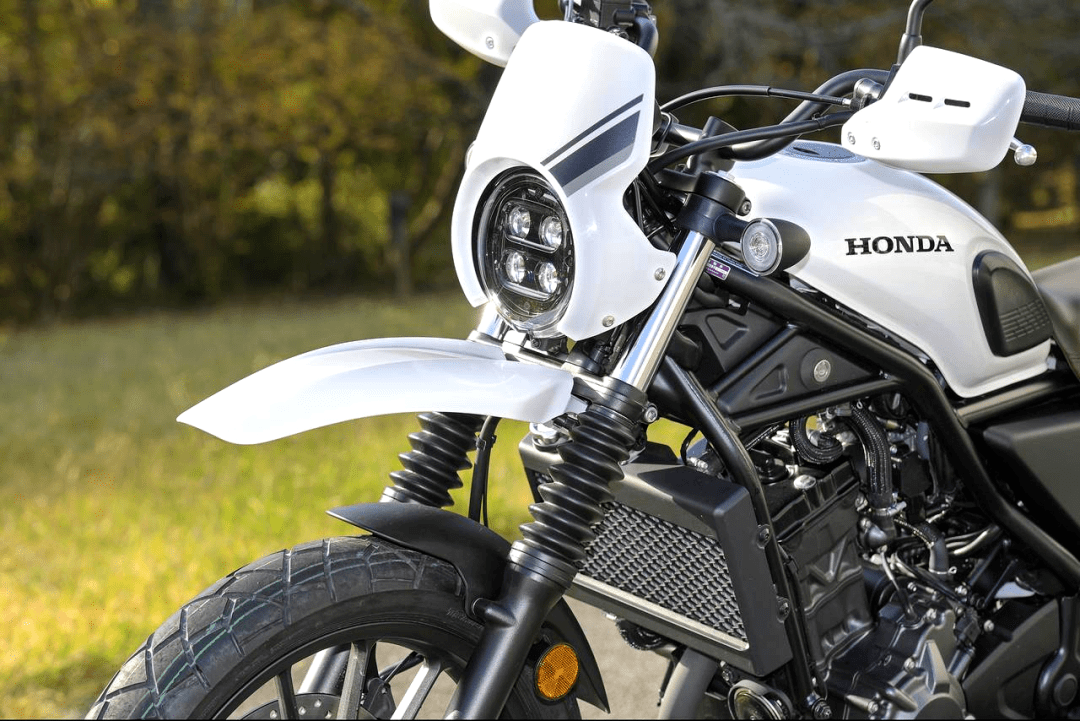 伴隨著即將推出全新的 CL250,Honda 同步發(fā)布了針對此車的原廠改裝件。下面的圖片,是裝上了原廠 Cross 風(fēng)格套件之后 CL250,而改裝項目則包括了車頭整流罩、越野風(fēng)格的雙層式前擋泥板、更平的鞍座等。