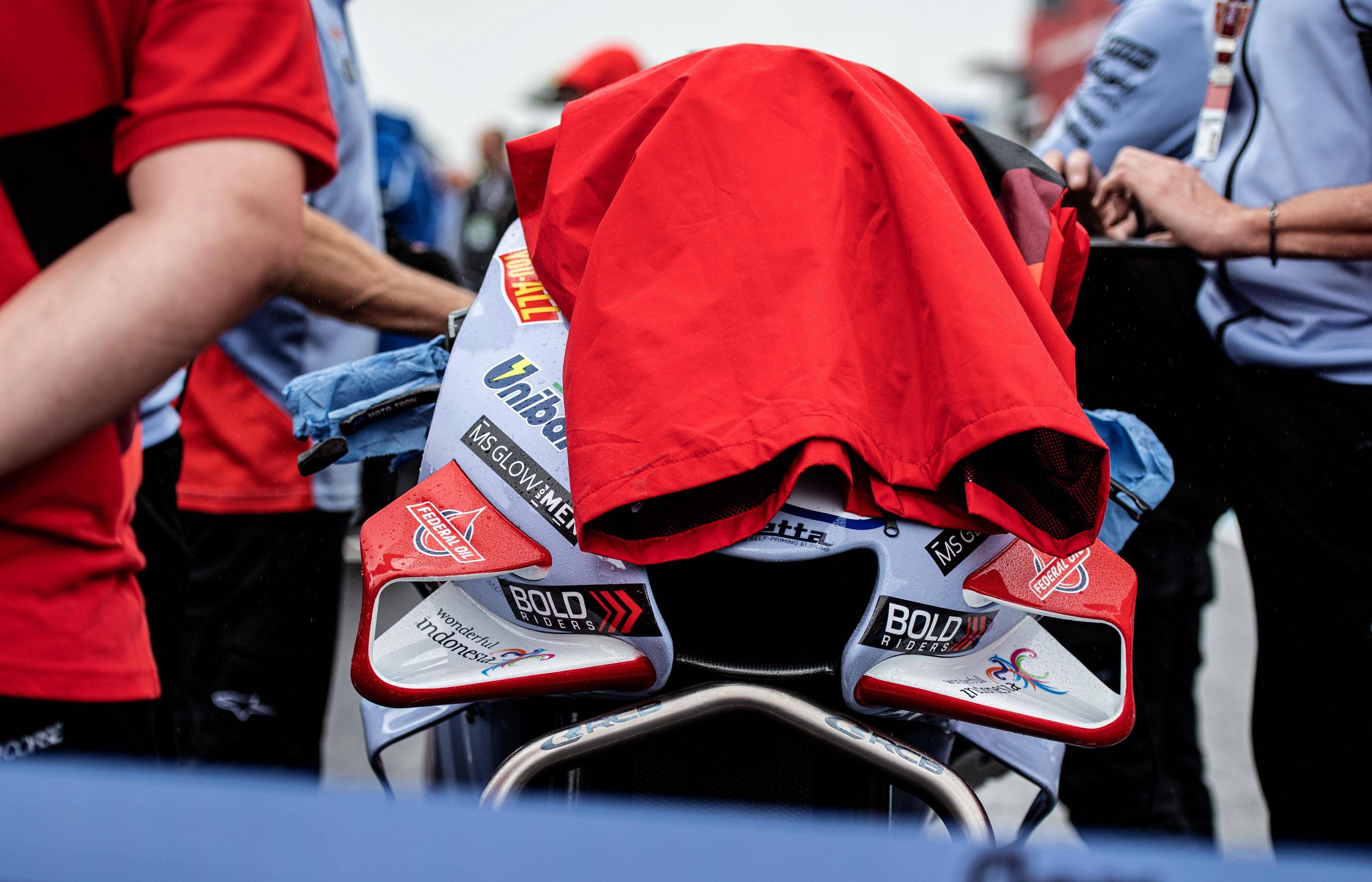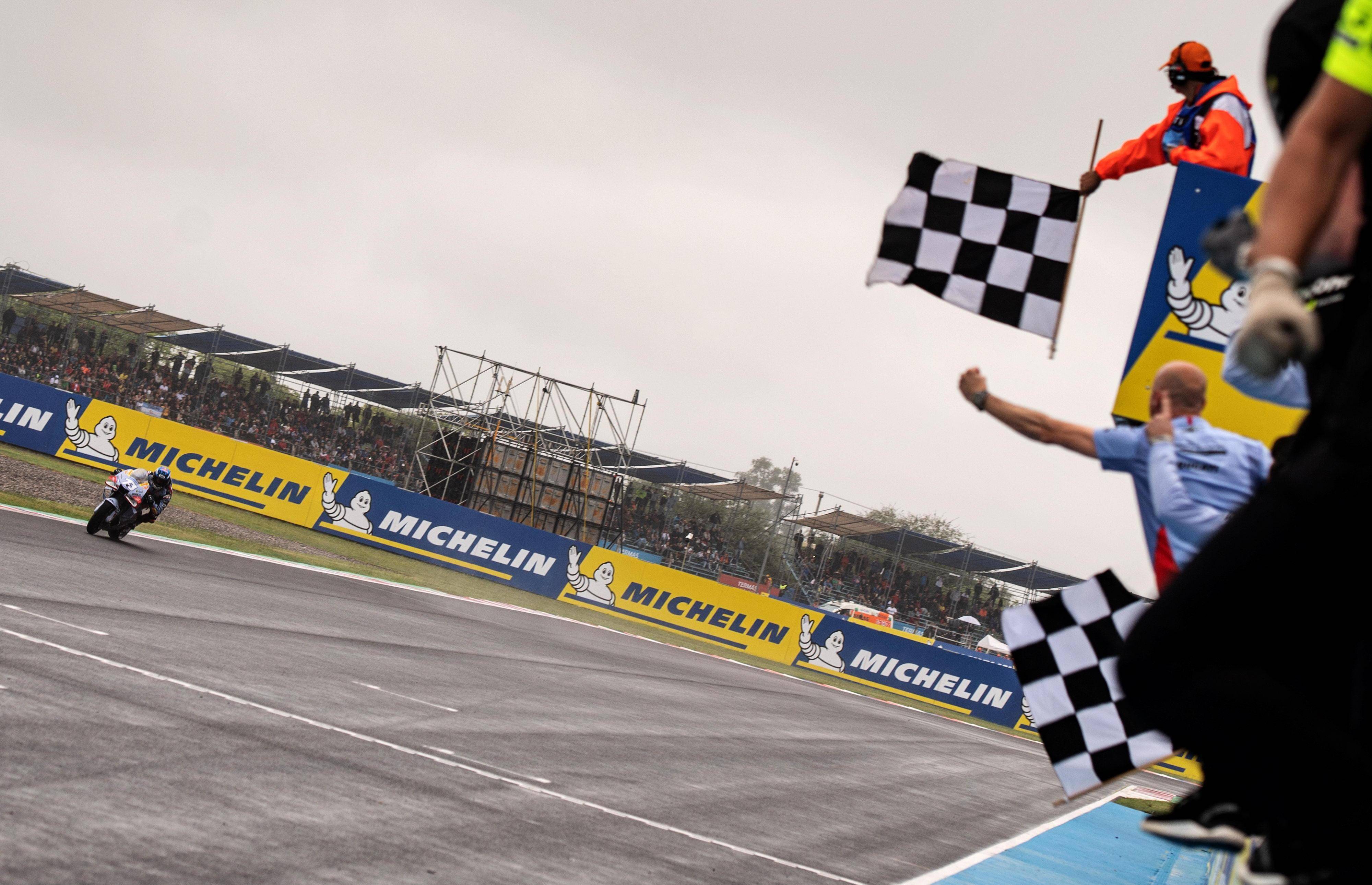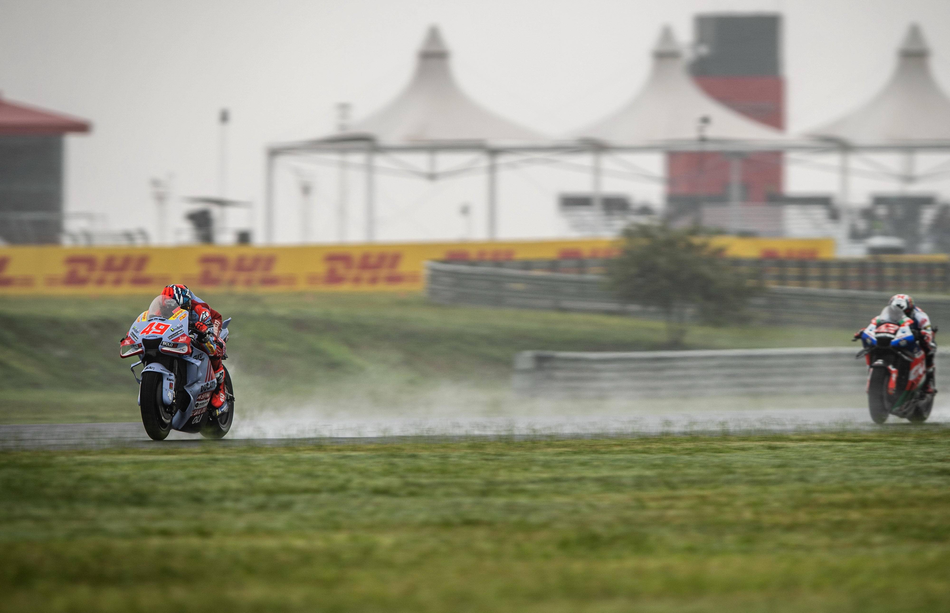 MotoGP 級別正式比賽的賽程是 25 圈、折合約 120 公里。賽事在濕滑的賽道上進(jìn)行,開跑時還下著雨、室外氣溫只有攝氏 18 度。