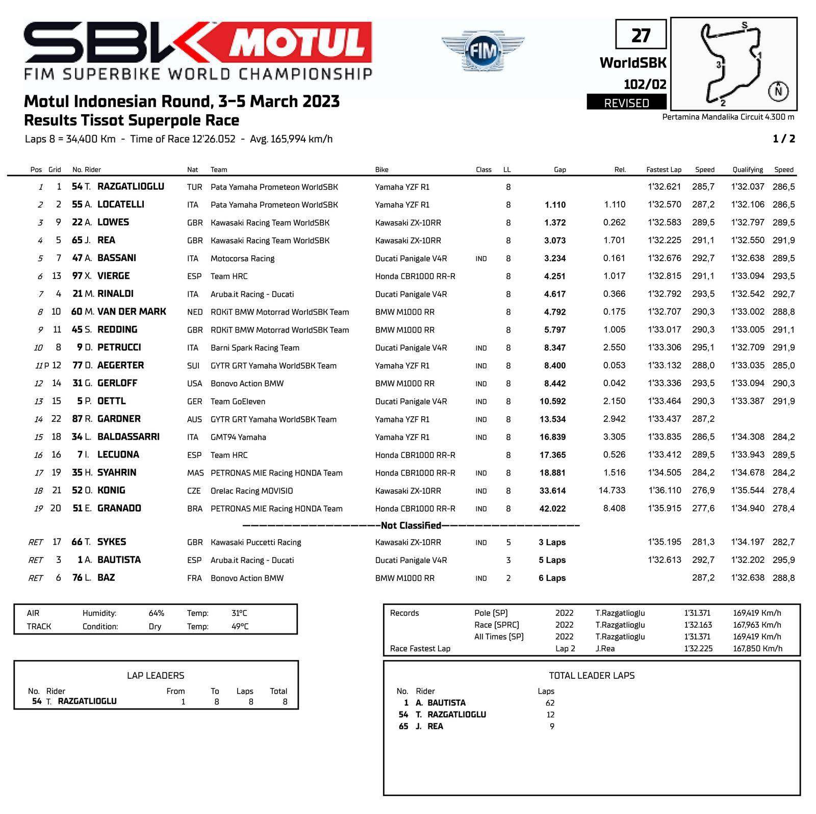 WSB 級(jí)別,賽前的 Super Pole 超級(jí)排位賽,54 號(hào)車(chē)、拉格里奧盧(Toprak Razgatlioglu)跑出了 1 分 32.037 秒的最佳圈速,奪得了第一節(jié)比賽的排頭位出賽;他的隊(duì)友、55 號(hào)車(chē)的洛卡泰利(Andrea Locatelli),1 號(hào)車(chē)的應(yīng)屆世界冠軍捌弟(Alvaro Bautista,巴迪斯塔),分別排在第二、第三位發(fā)車(chē)。