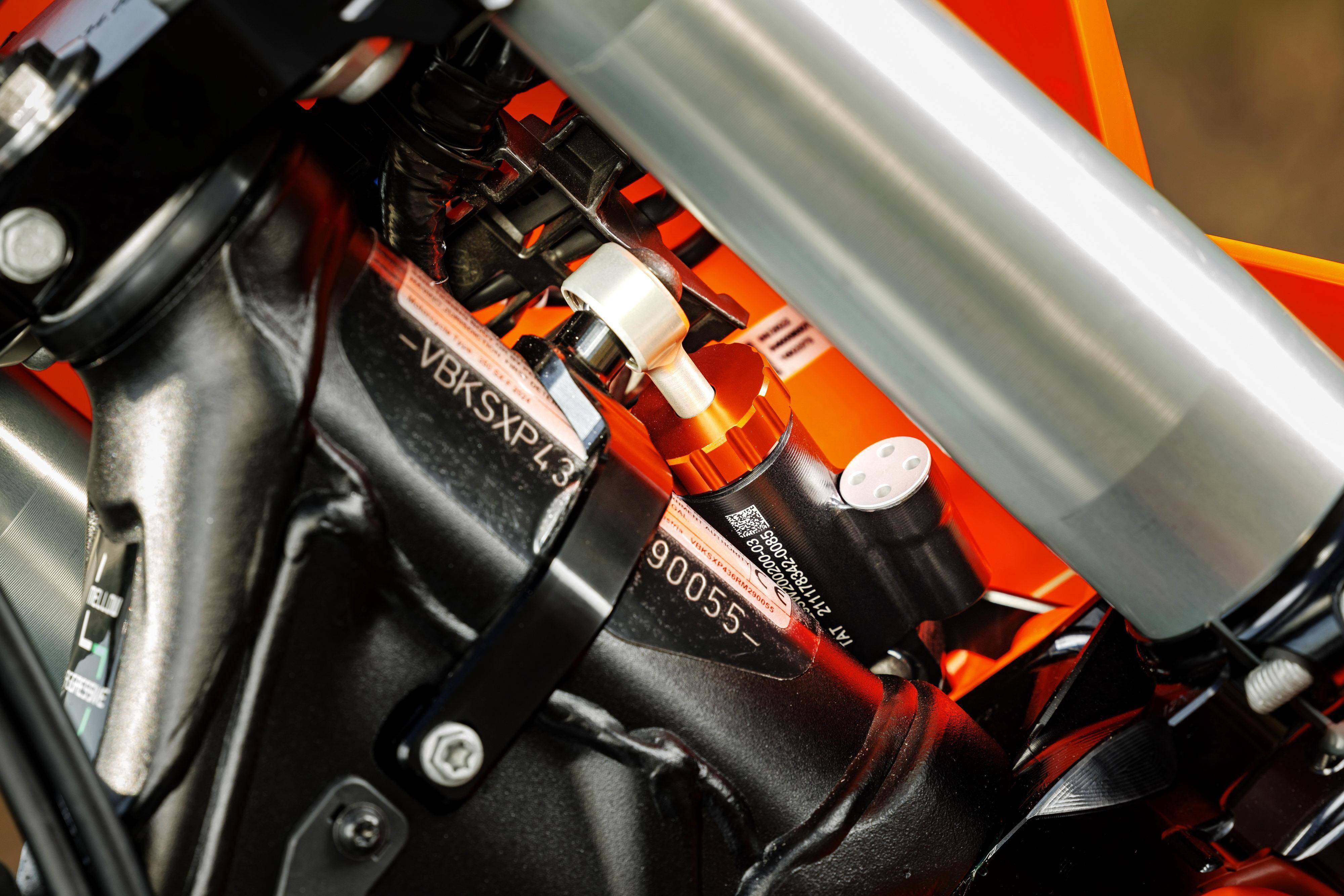 與 2023 款相比,新的 2024 年款車型最大的變化是前后懸掛系統(tǒng)經(jīng)過了新的設(shè)置,目標(biāo)是提高車輛的平衡性和舒適性,并同時(shí)增加轉(zhuǎn)向時(shí)的靈活性:叉芯口徑為 48 mm 、WP 配套的倒立式前叉,內(nèi)部的阻尼、觸底阻力經(jīng)過改進(jìn),讓前叉行程即使是在強(qiáng)力觸底之后、馬上就采取強(qiáng)力加速的動(dòng)作時(shí),依然能夠保持穩(wěn)定性;后面的 WP XACT 減震有著新的阻尼特性,可提供更好的牽引力和沖擊吸收。