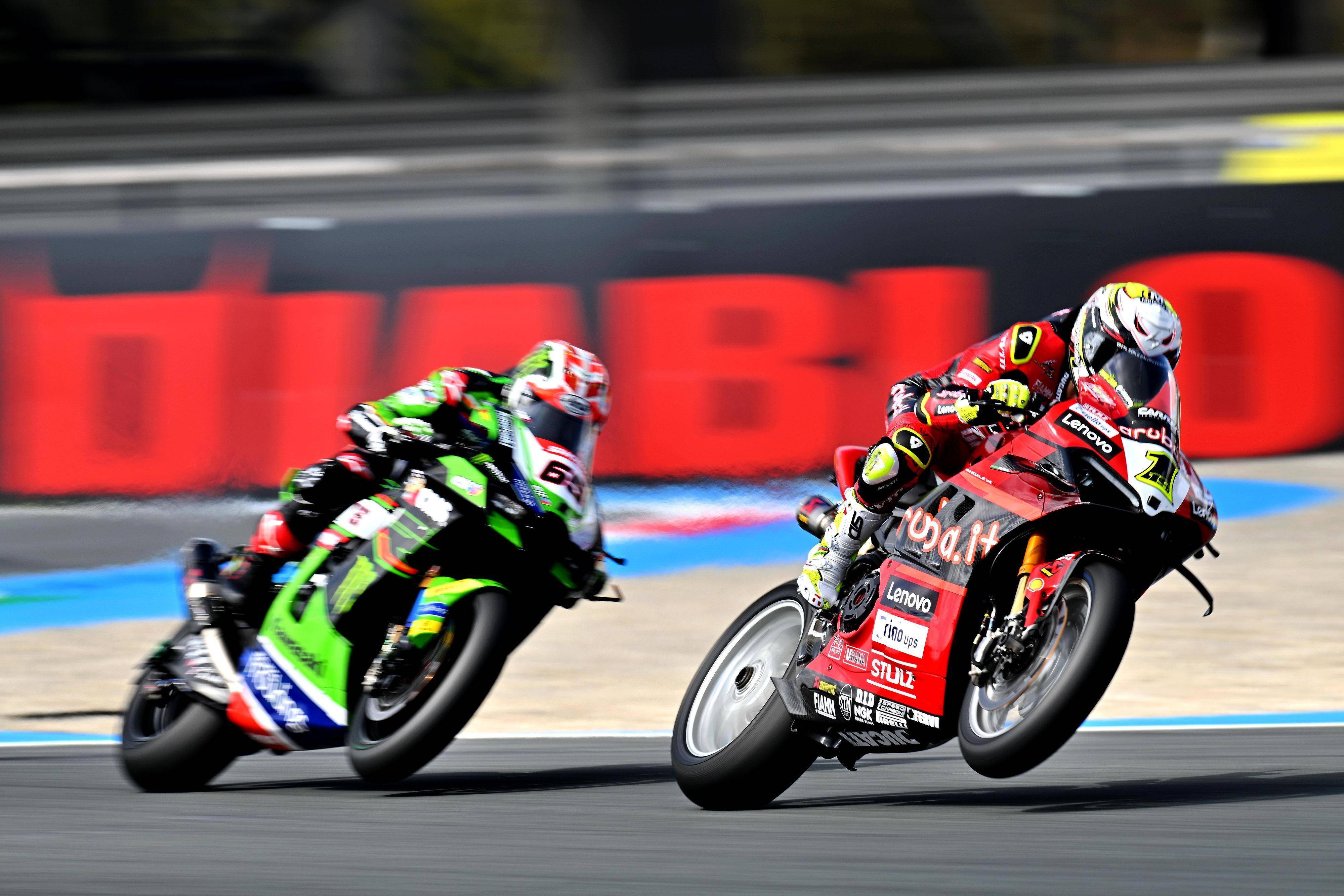 WSB 級別,賽前的 Super Pole 超級排位賽是被官方稱之為 Titanic fights “ 巨人大戰(zhàn) ” 的追逐,1 號車的應(yīng)屆世界冠軍捌弟(Alvaro Bautista,巴迪斯塔)以 1 分 33.542 秒的最佳圈速,獲得了排頭位出賽。后面,65 號車的雷亞(Jonathan Rea)和 54 號車的拉格里奧盧(Toprak Razgatlioglu)分別排在第二、第三位起步。