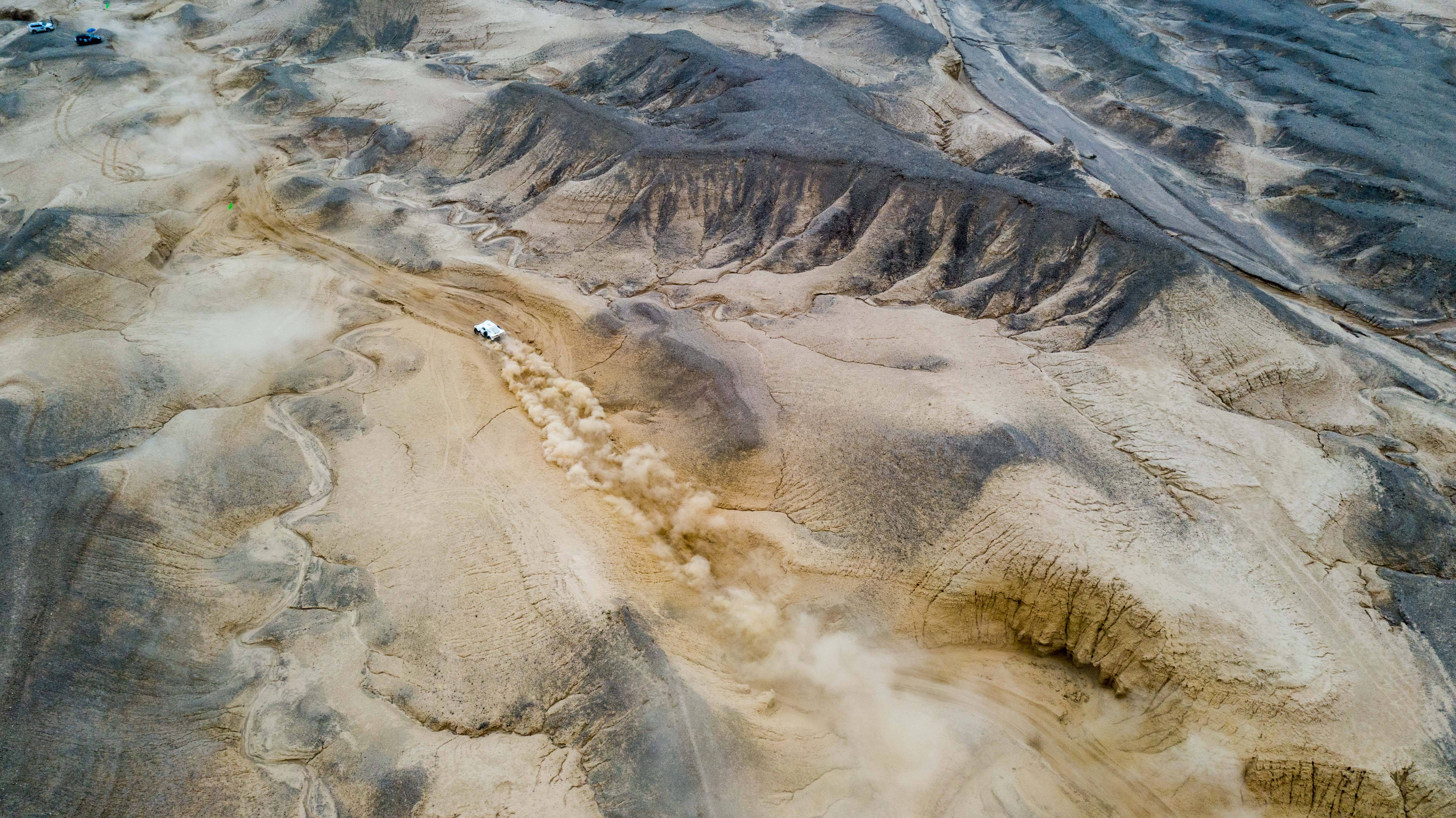 圖為2019環(huán)塔拉力賽上,賽車行駛在干涸的河床賽道上