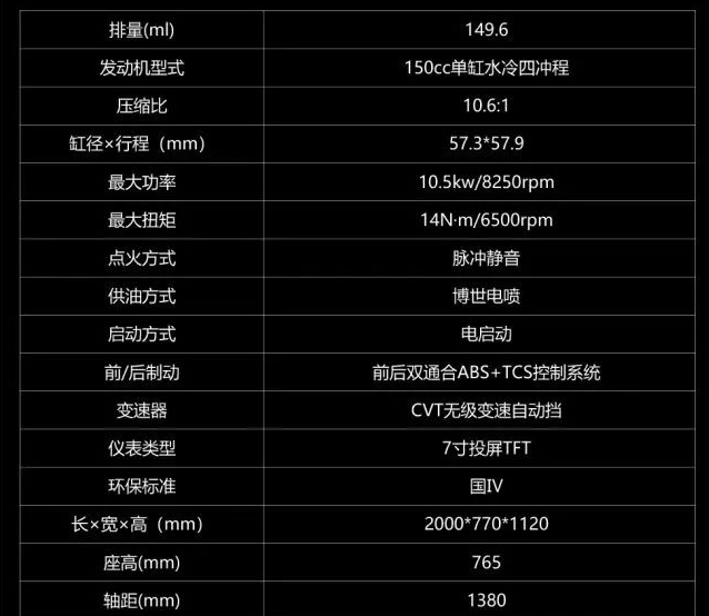 配備了7寸TFT全彩液晶儀表,可能是目前150級別踏板中最大尺寸的,支持手機投屏、來電顯示。