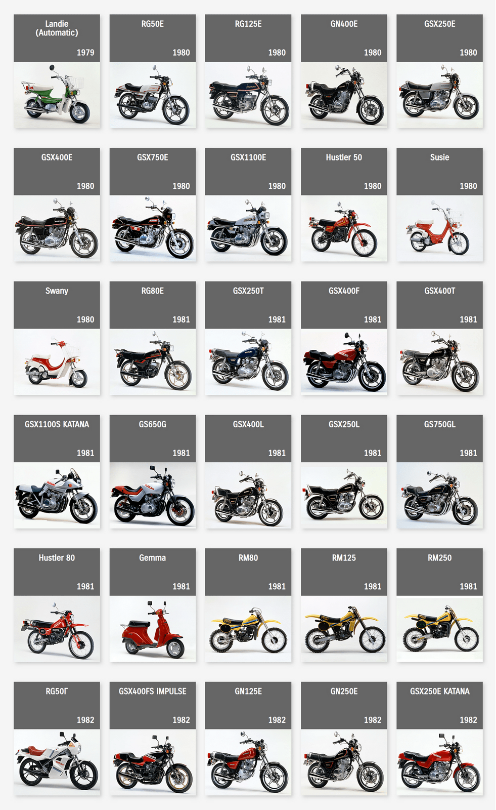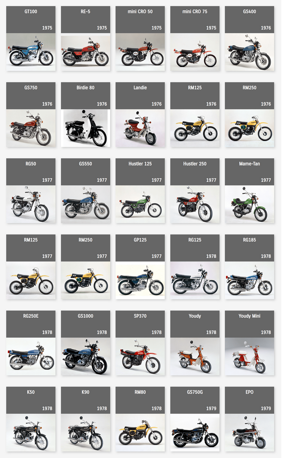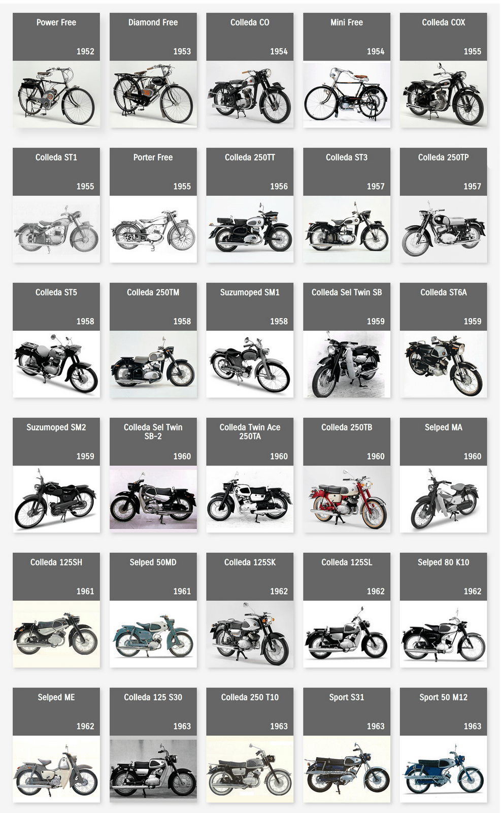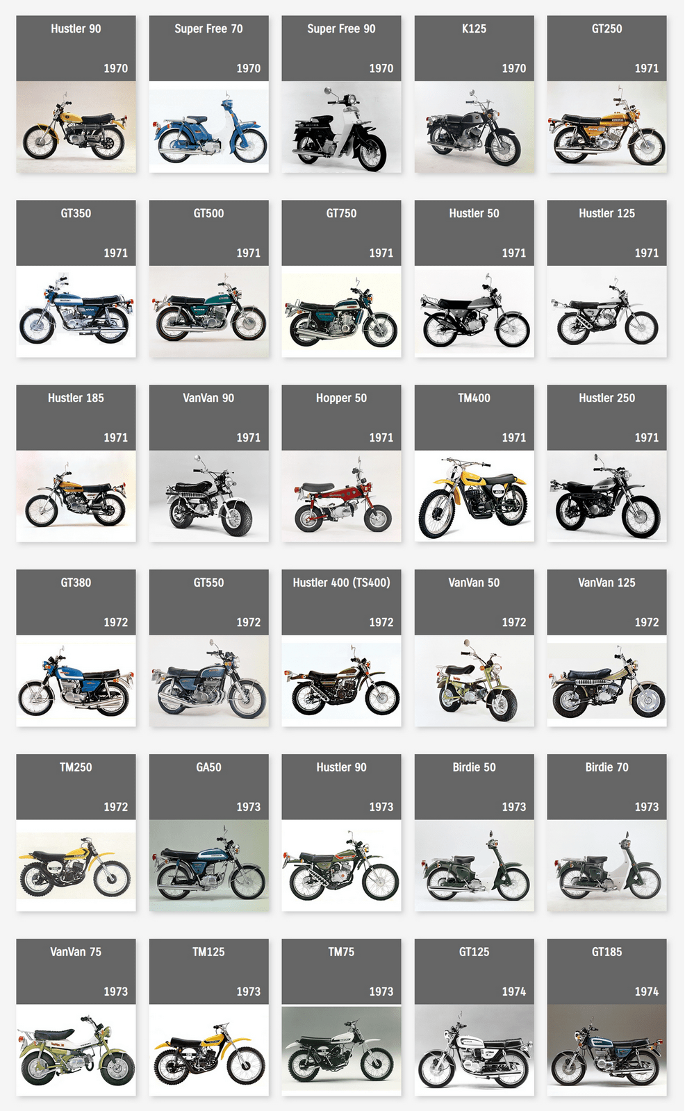 下面的圖片來自 Suzuki Global,是這家日本制造商自 1952 年到 2022 年,在摩托車領(lǐng)域里大部分量產(chǎn)車的型號清單。 (以發(fā)布年份的先后 粗略排列)