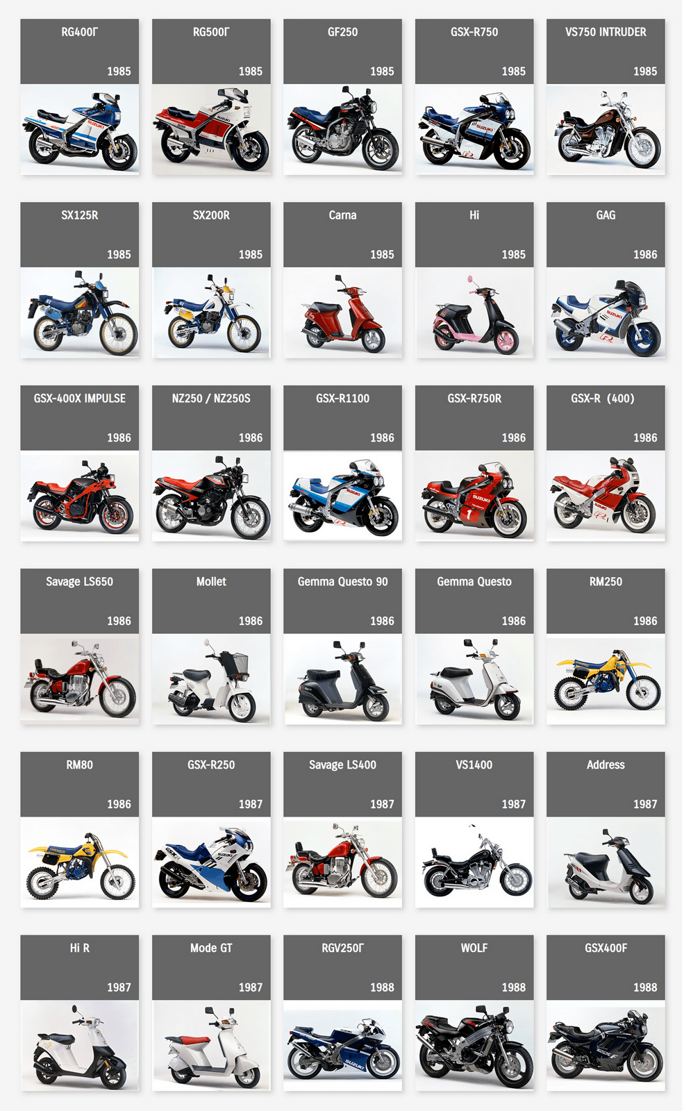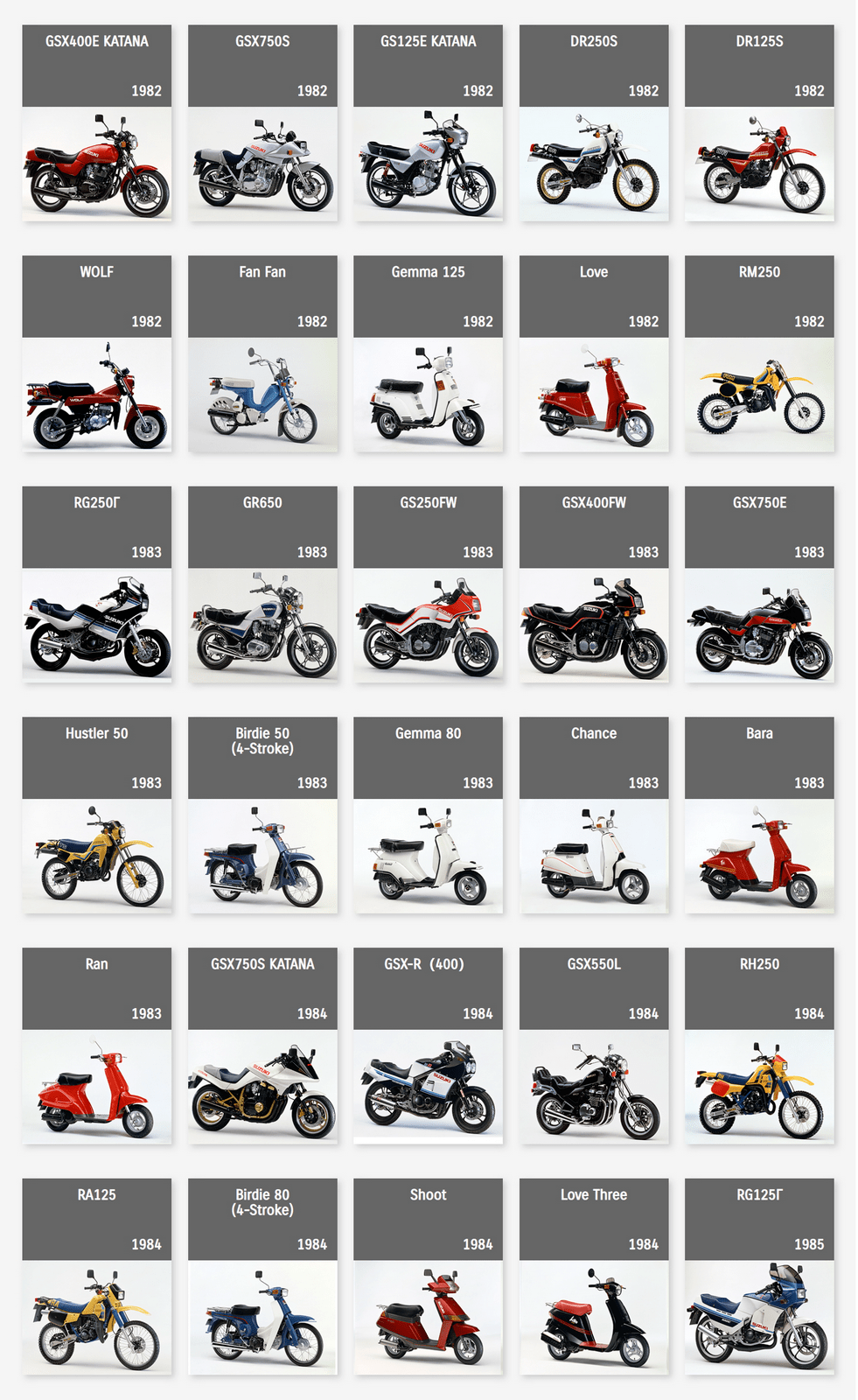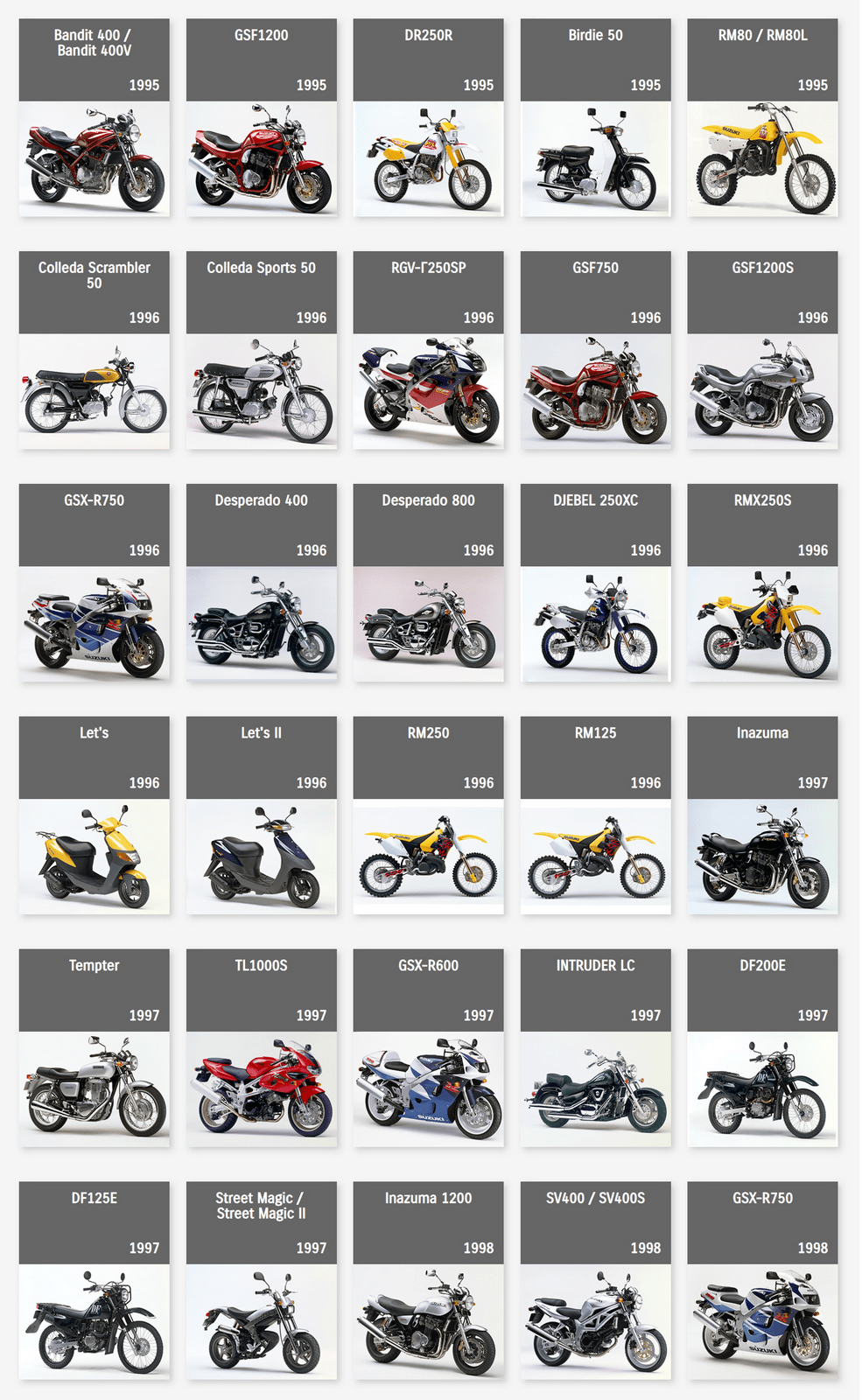 下面的圖片來自 Suzuki Global,是這家日本制造商自 1952 年到 2022 年,在摩托車領(lǐng)域里大部分量產(chǎn)車的型號清單。 (以發(fā)布年份的先后 粗略排列)