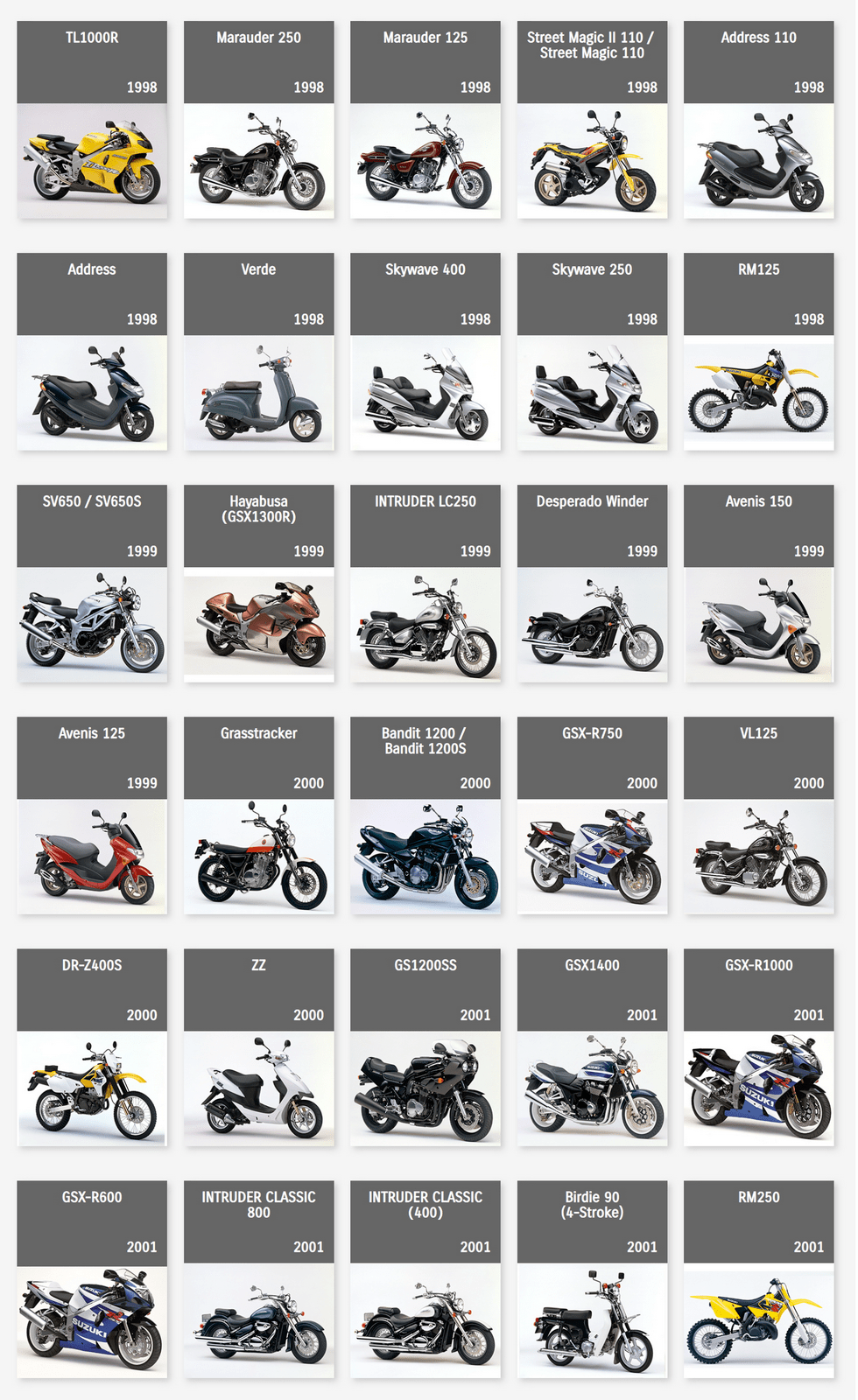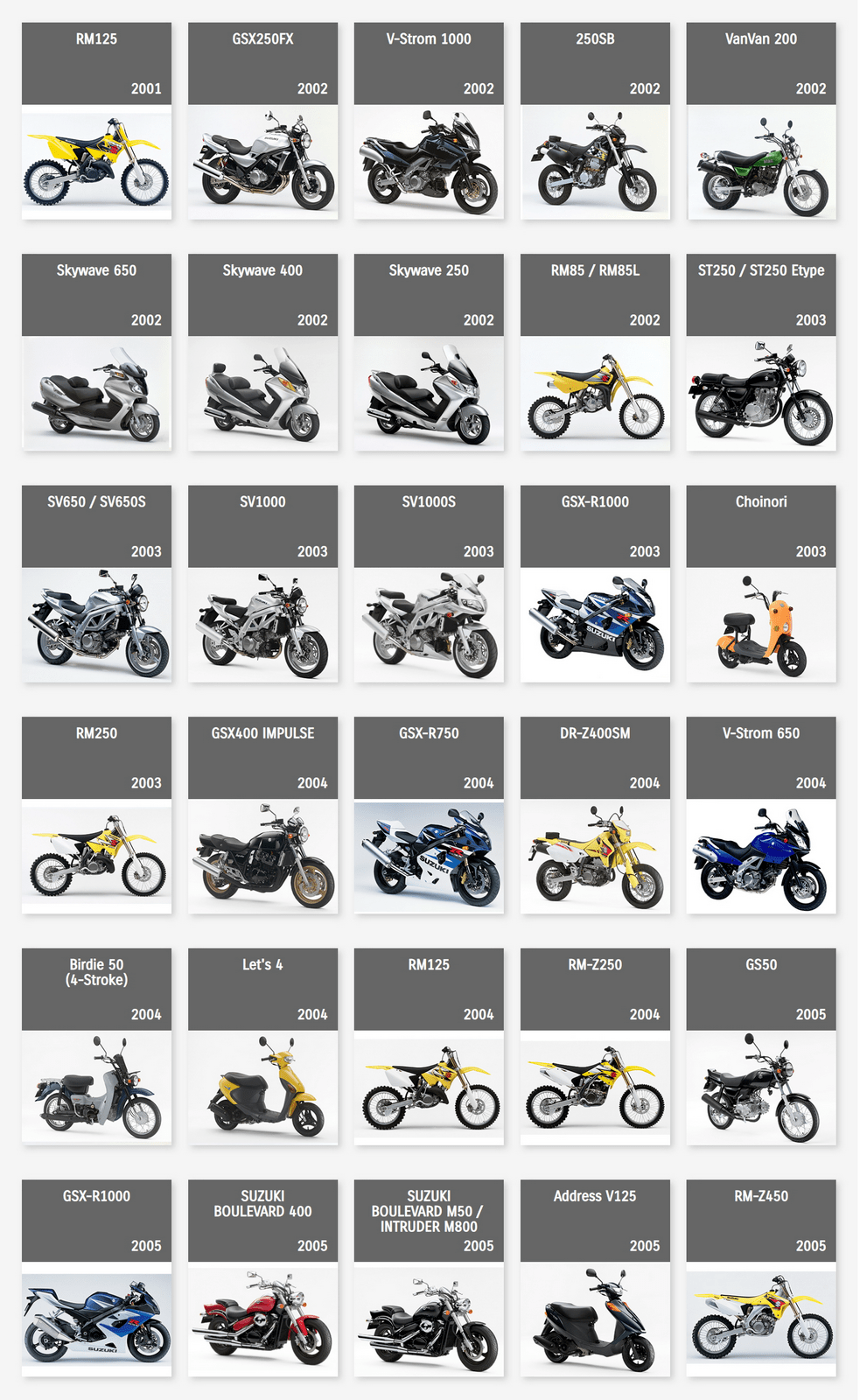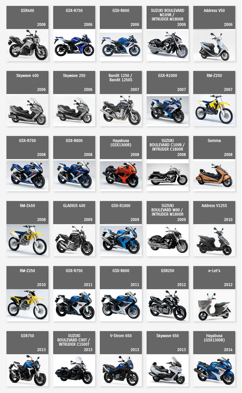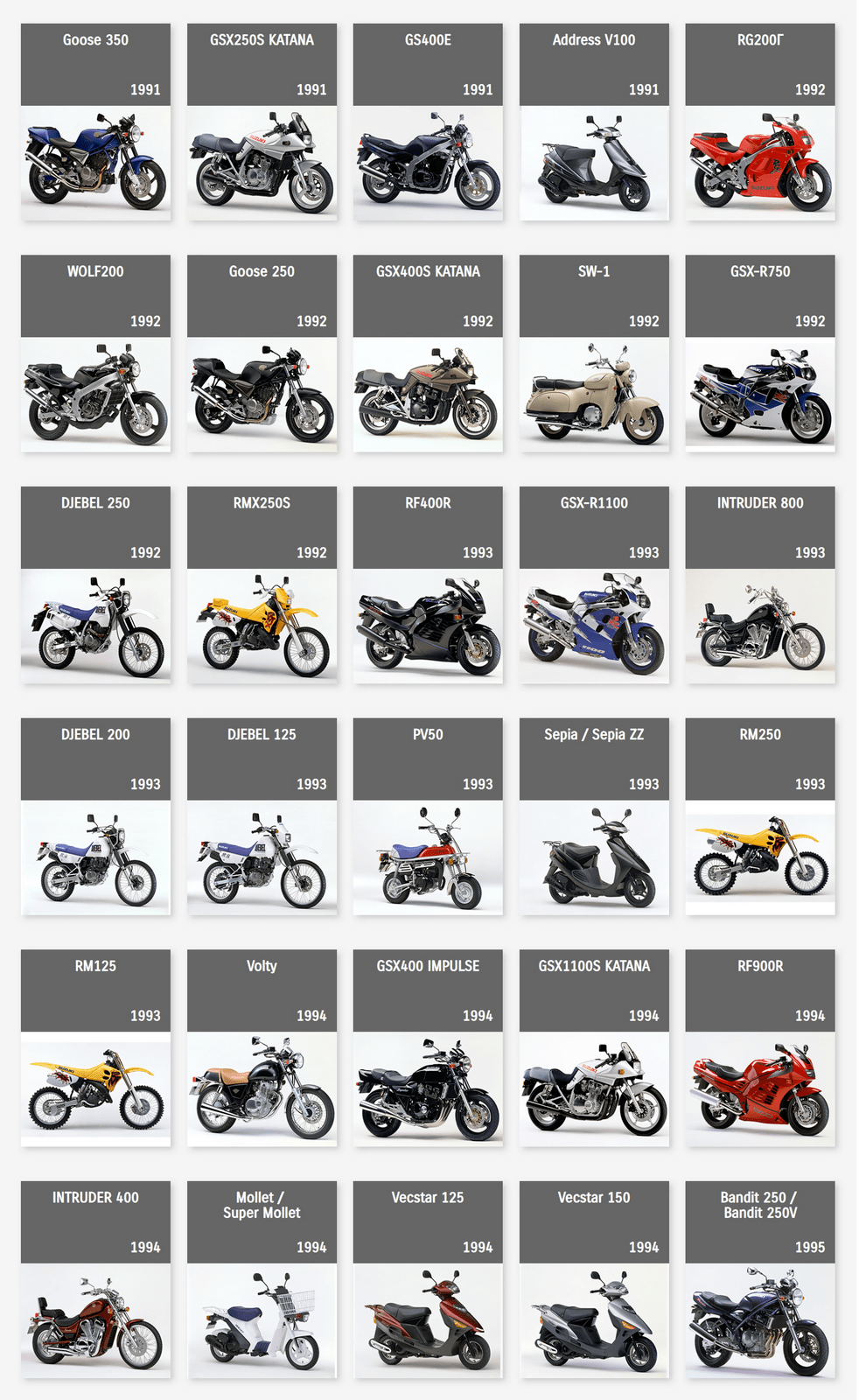 下面的圖片來自 Suzuki Global,是這家日本制造商自 1952 年到 2022 年,在摩托車領(lǐng)域里大部分量產(chǎn)車的型號清單。 (以發(fā)布年份的先后 粗略排列)