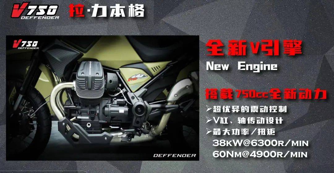 引擎采用長江全新開發(fā)的V型雙缸750cc動力,最大功率38kw/6300rpm,最大扭矩60N.m/4900rpm,配合軸傳動5檔變速,可以看出這是一臺更注重低轉(zhuǎn)速出力的車型,在非鋪裝路面脫困的表現(xiàn)良好,符合V750拉力風(fēng)格的設(shè)定。發(fā)動機(jī)是長江逆向研發(fā)摩托古茲的V7 750V型雙缸。