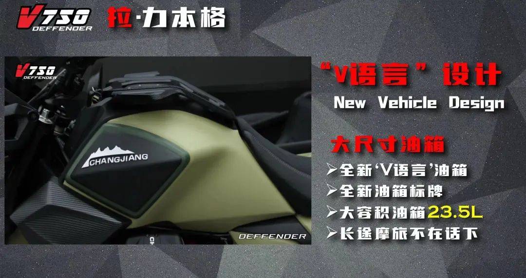 外觀風(fēng)格方面有別于之前的700挎子軍事風(fēng)格的設(shè)定,衛(wèi)士750更明顯的拉力取向,整車的設(shè)計(jì)遵循“V”語言的風(fēng)格,包括全新的風(fēng)檔設(shè)計(jì),倒V式的日間行車燈,更具棱角的油箱造型,尤其是橫置V型引擎,將“V”語言貫徹到底,非常有辨識度,個(gè)性化十足。