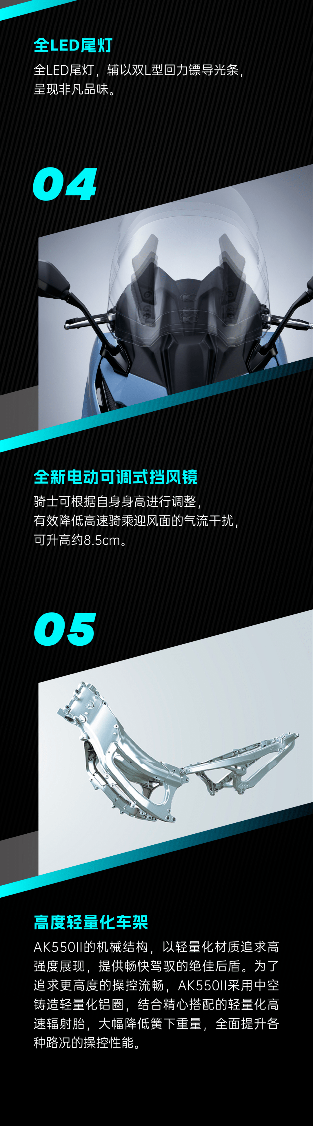 其次升級(jí)了電動(dòng)風(fēng)擋,可實(shí)現(xiàn)最高最低8.5厘米的高差,以及全新的無(wú)鑰匙系統(tǒng)。最后,AK550II 搭載了新一代的Bosch 9.1MP ABS,內(nèi)部設(shè)有剎車壓力感測(cè)器,能在ABS 做動(dòng)時(shí)主動(dòng)配合剎車力道提供最適當(dāng)?shù)幕仞?。新車外部線條由較為侵略性的折線改為較為平緩收斂的造型,車頭部分采用了多層浮動(dòng)式設(shè)計(jì),日行燈眉由導(dǎo)光條改為燈珠,搭配晶鉆內(nèi)構(gòu)帶來(lái)更細(xì)致的質(zhì)感。