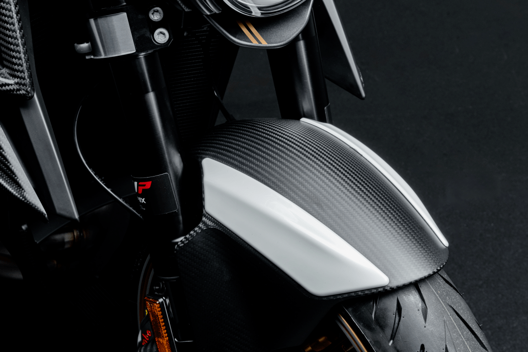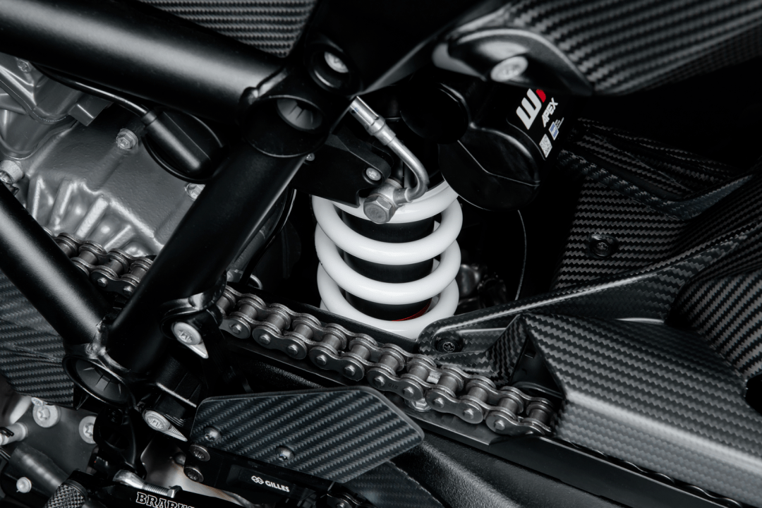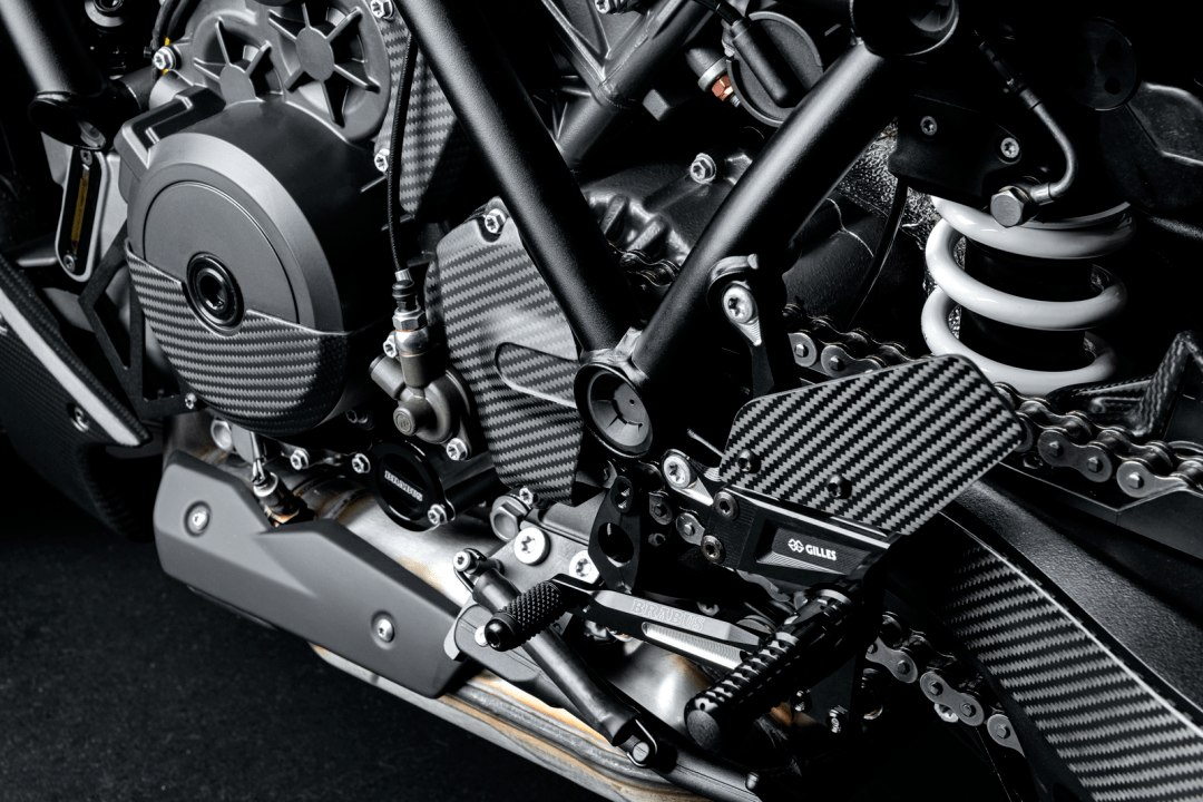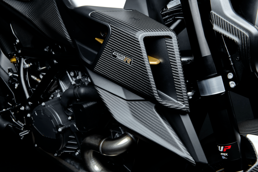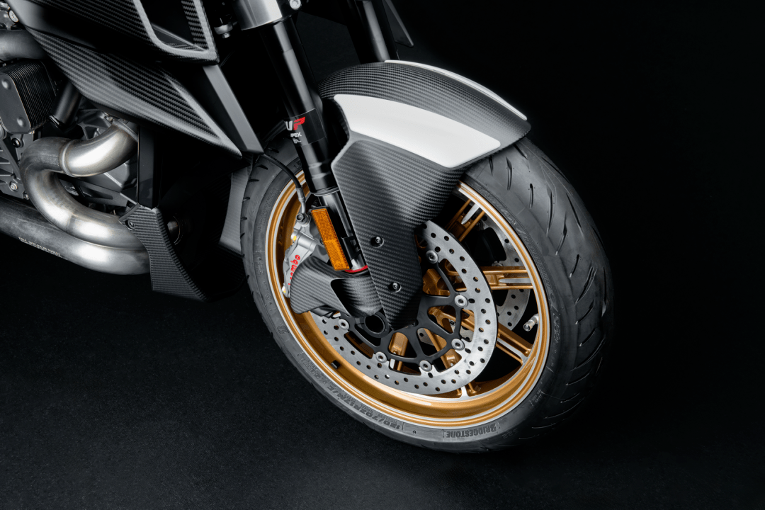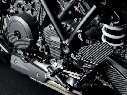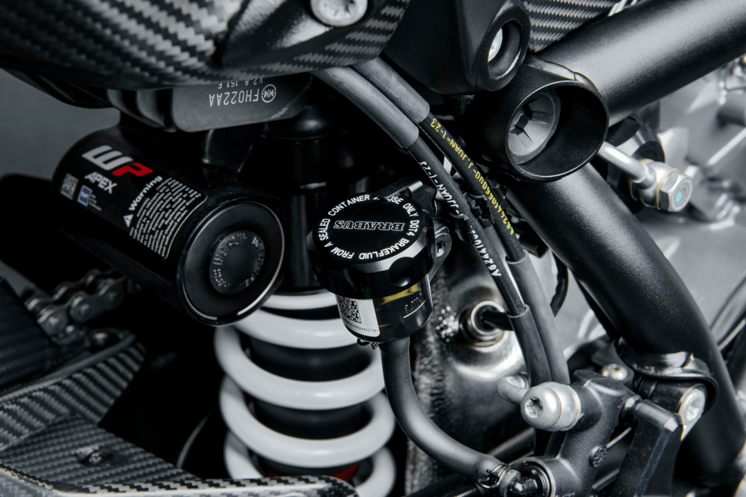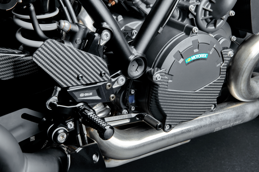 新的 Brabus 博速 1300 R Masterpiece 杰作版沿用了 KTM 1290 Super Duke R Evo 的水冷 V 型 75 度兩氣缸、DOHC 每氣缸四氣閥的 LC8 發(fā)動機,排氣量 1301 cc,最大動力輸出同為 132 kw(約 180 匹)。車體沿用了鋼管式的車架、后單搖臂,WP 配套的前后懸掛系統(tǒng)等。